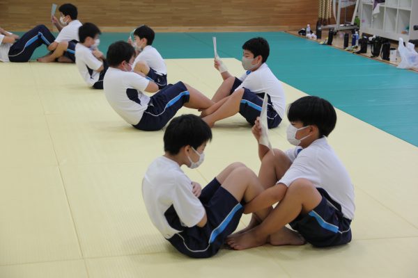 今日は中学1年生の体育で上体起こしを行っていましたが,クリアファイルを利用して感染予防をしていました。