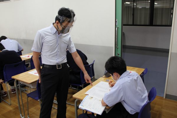 教員も近い距離で生徒対応をする際は,マスクに加えてフェイスシールドを着用するなど感染予防には細心の注意を払っています。