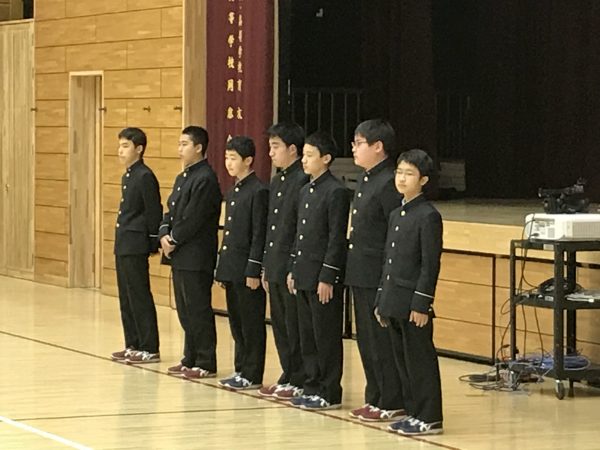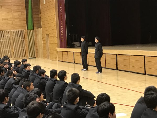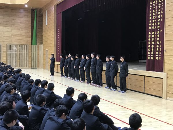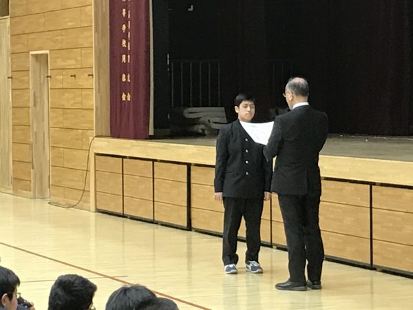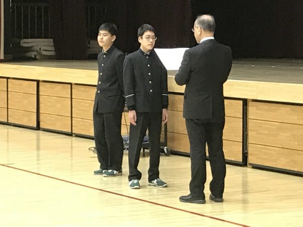 校長の話にさきだち、育友奨学生の紹介、新生徒会役員の紹介、部活動の表彰を行いました。