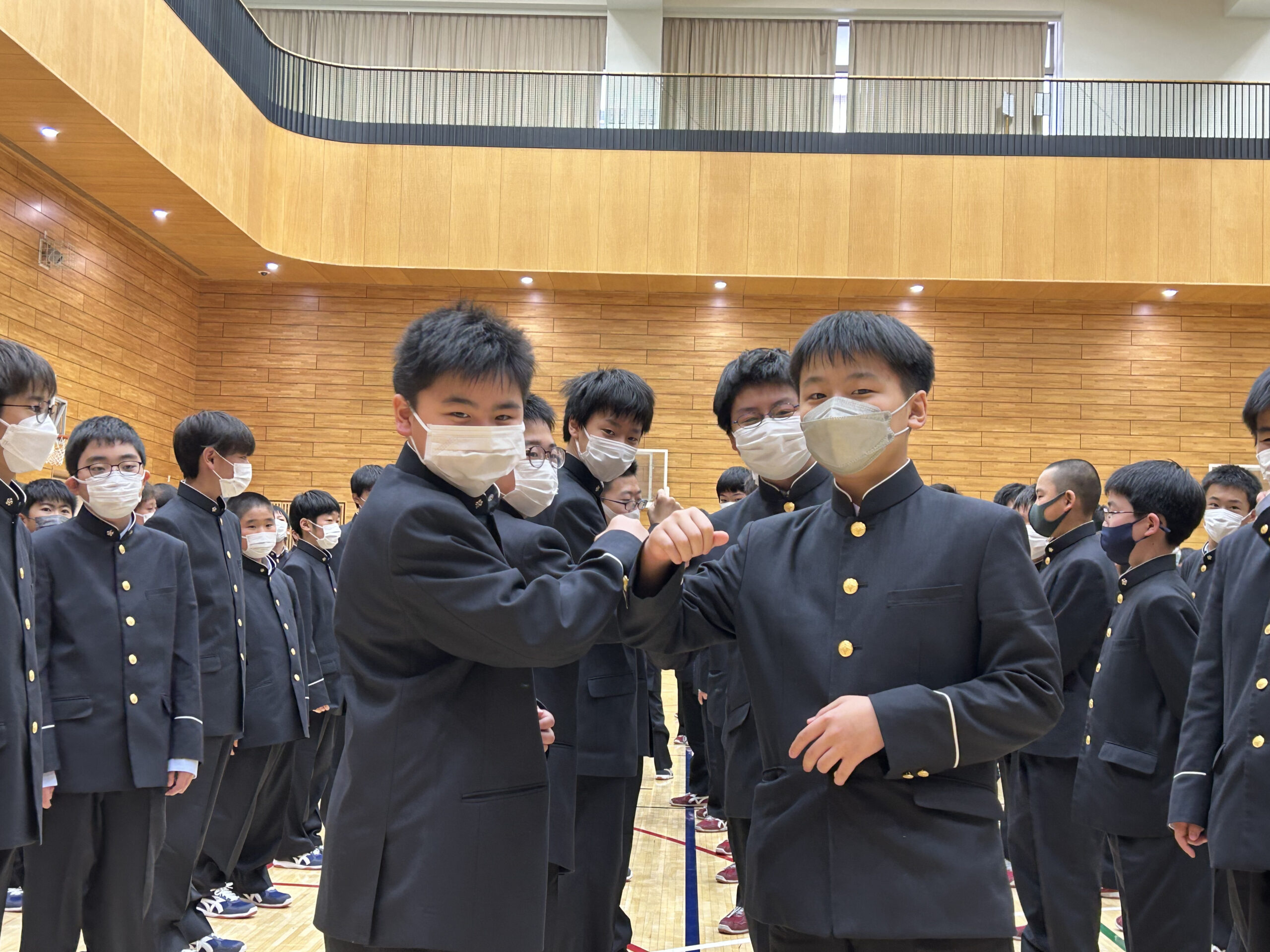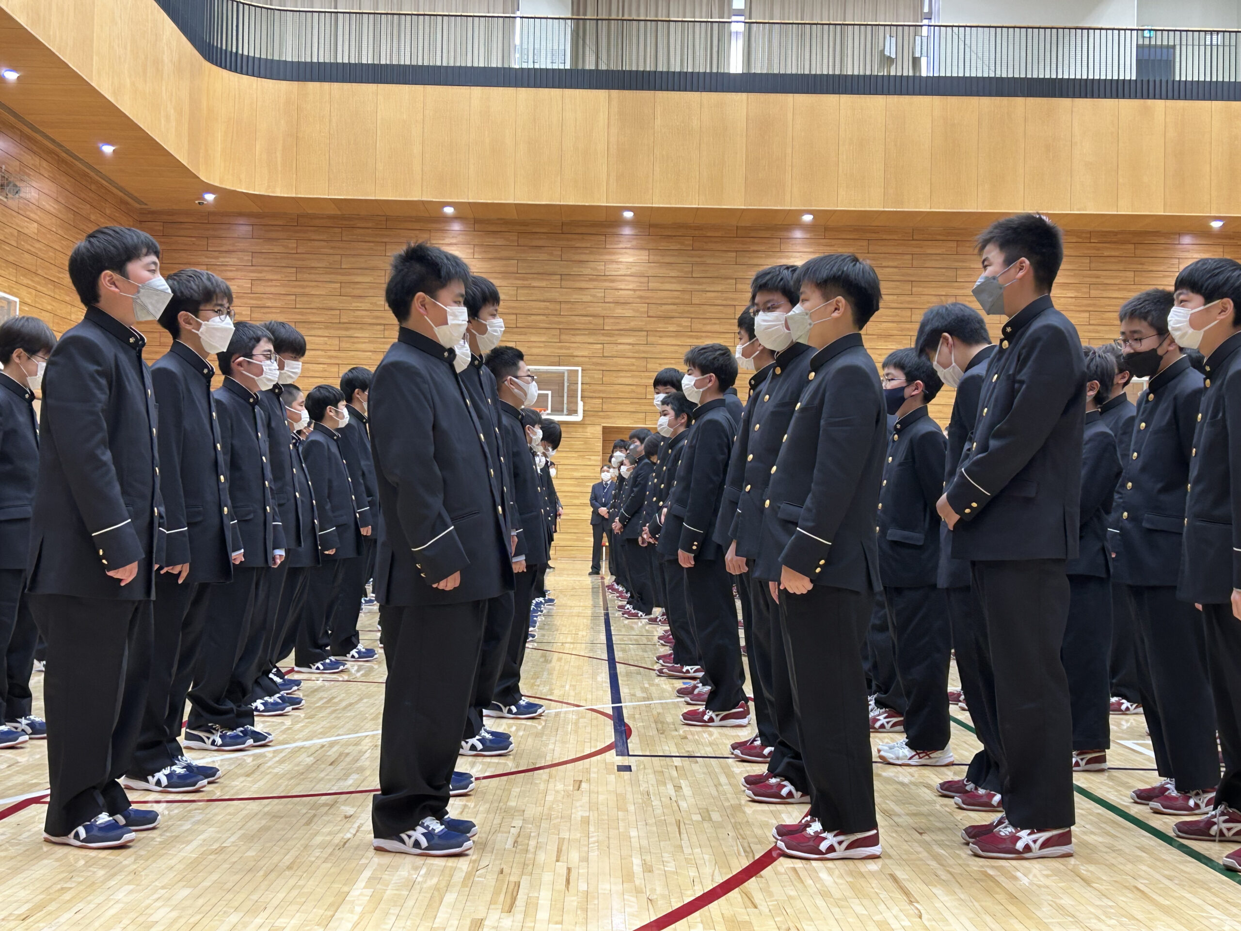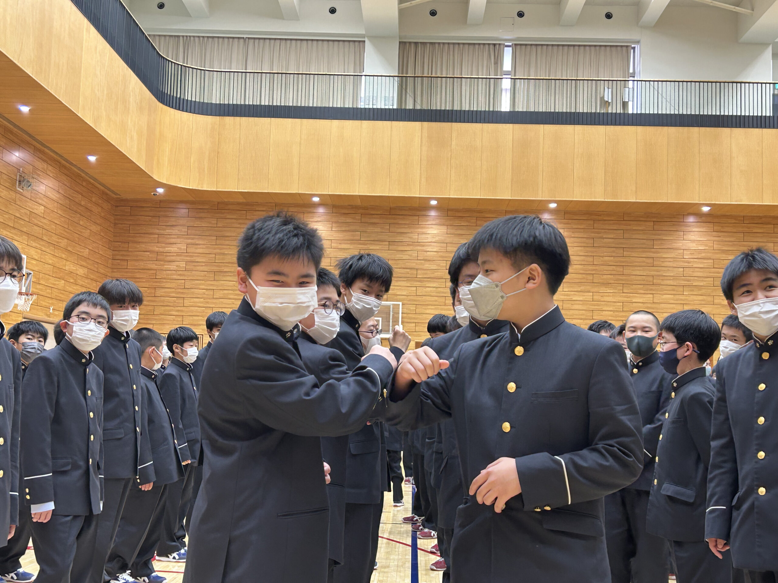 新入生と上級生が向き合いあいさつ。豊山の仲間が増えました。