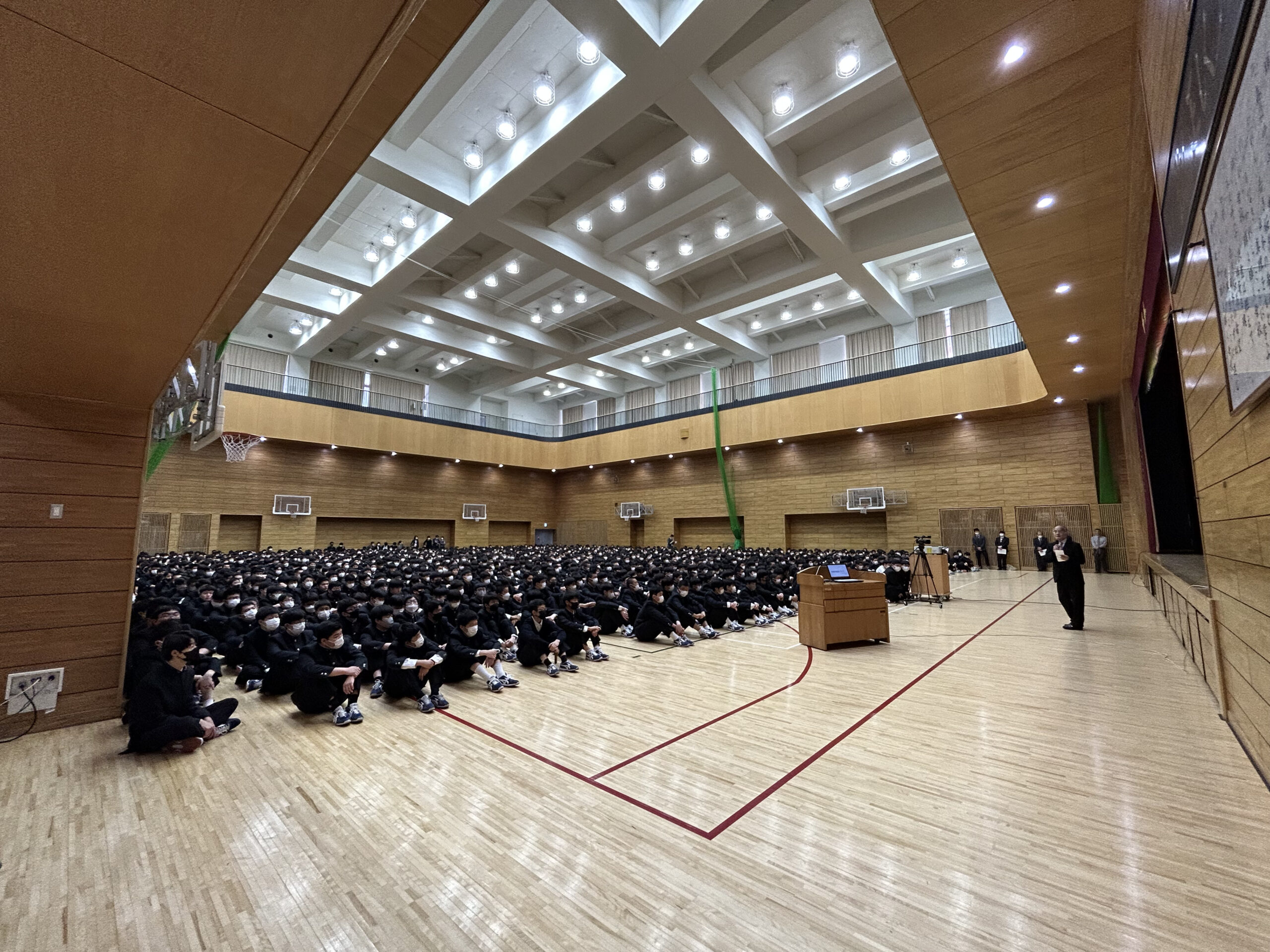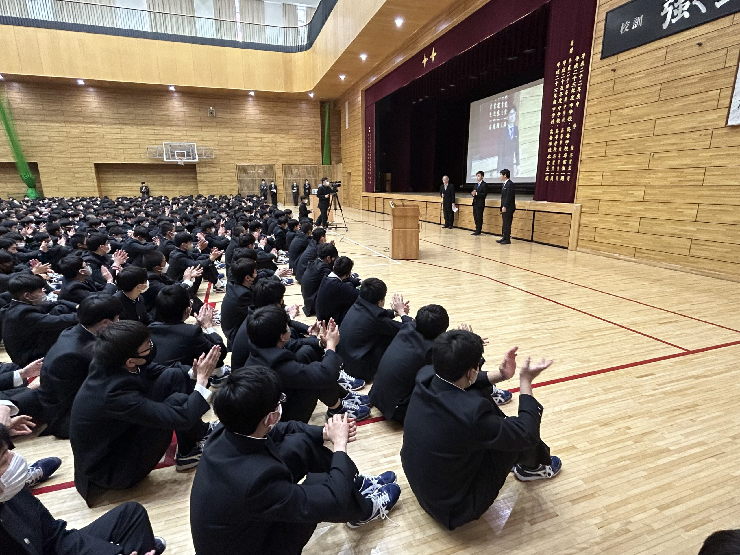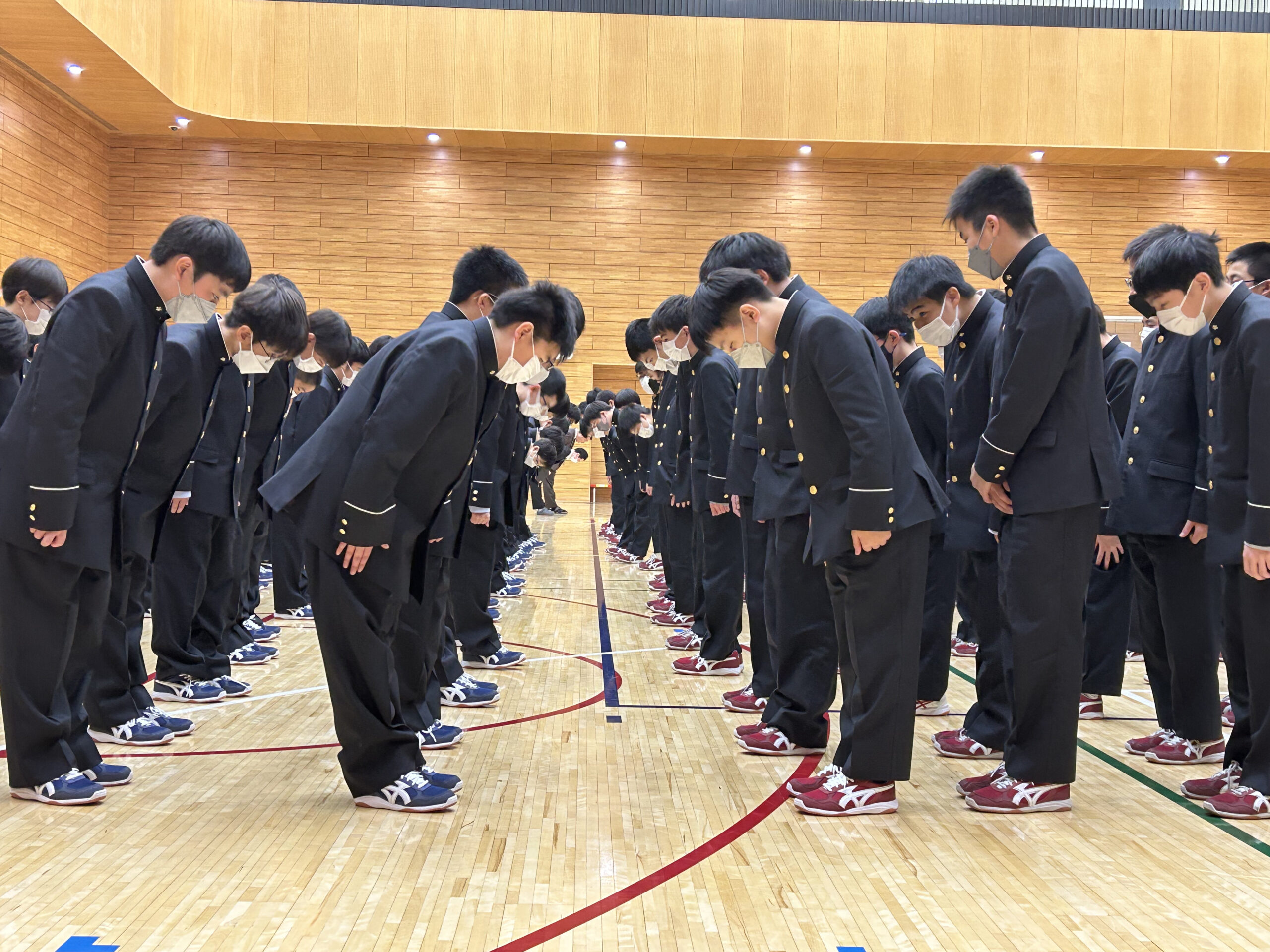 新入生と上級生が向き合いあいさつ。豊山の仲間が増えました。