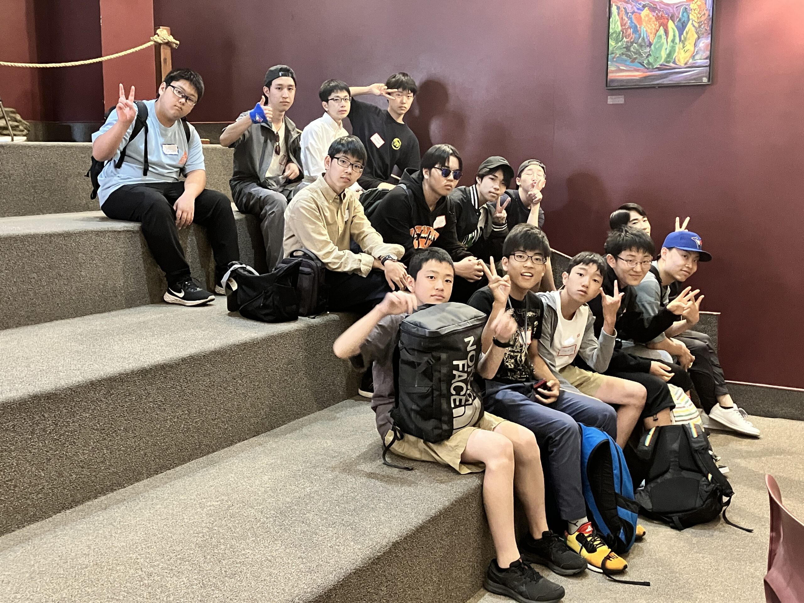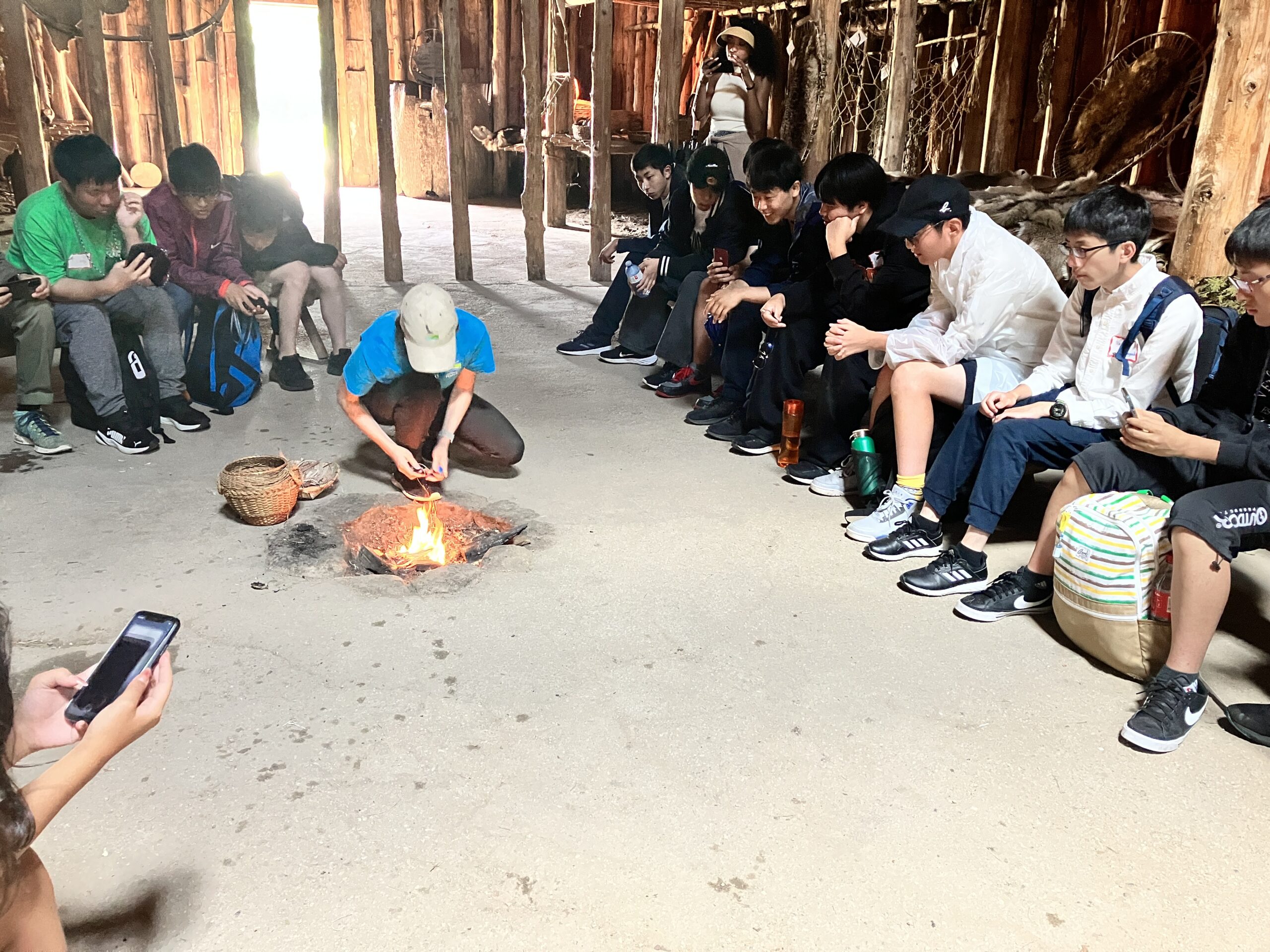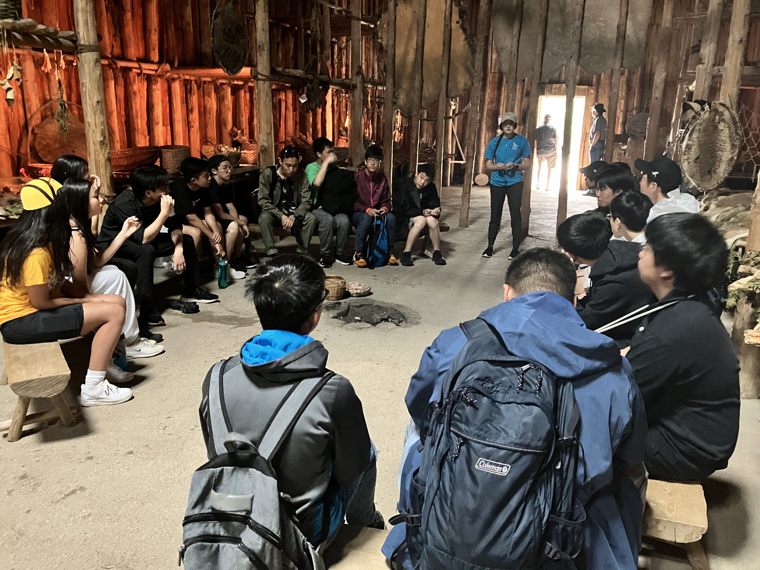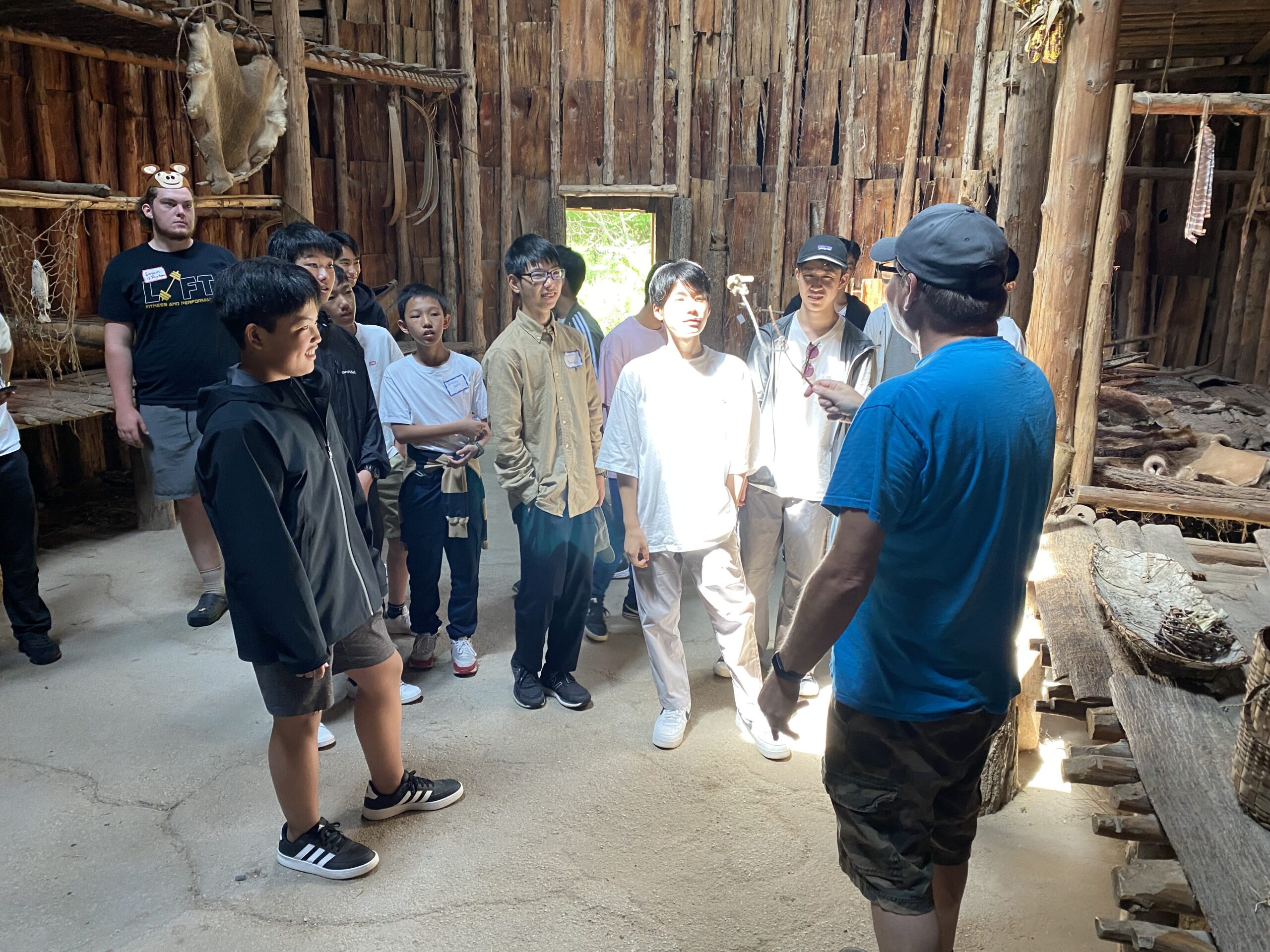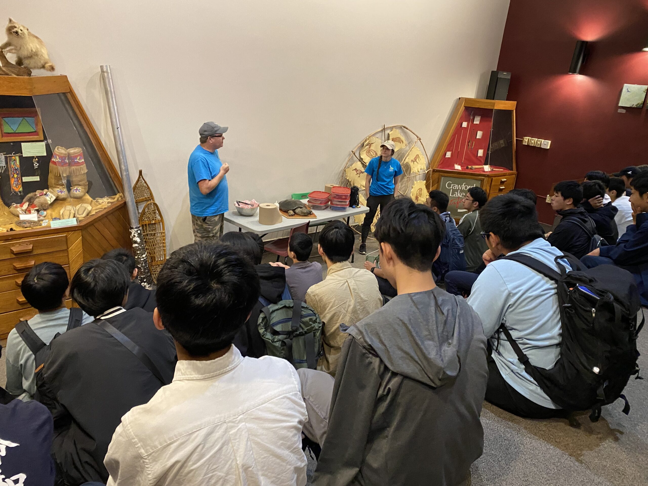 カナダの先住民が暮らしていた「long house=長屋」のレプリカの中で,火おこしの方法を見学したり,実際の毛皮に触ったりして,先住民について学びました。