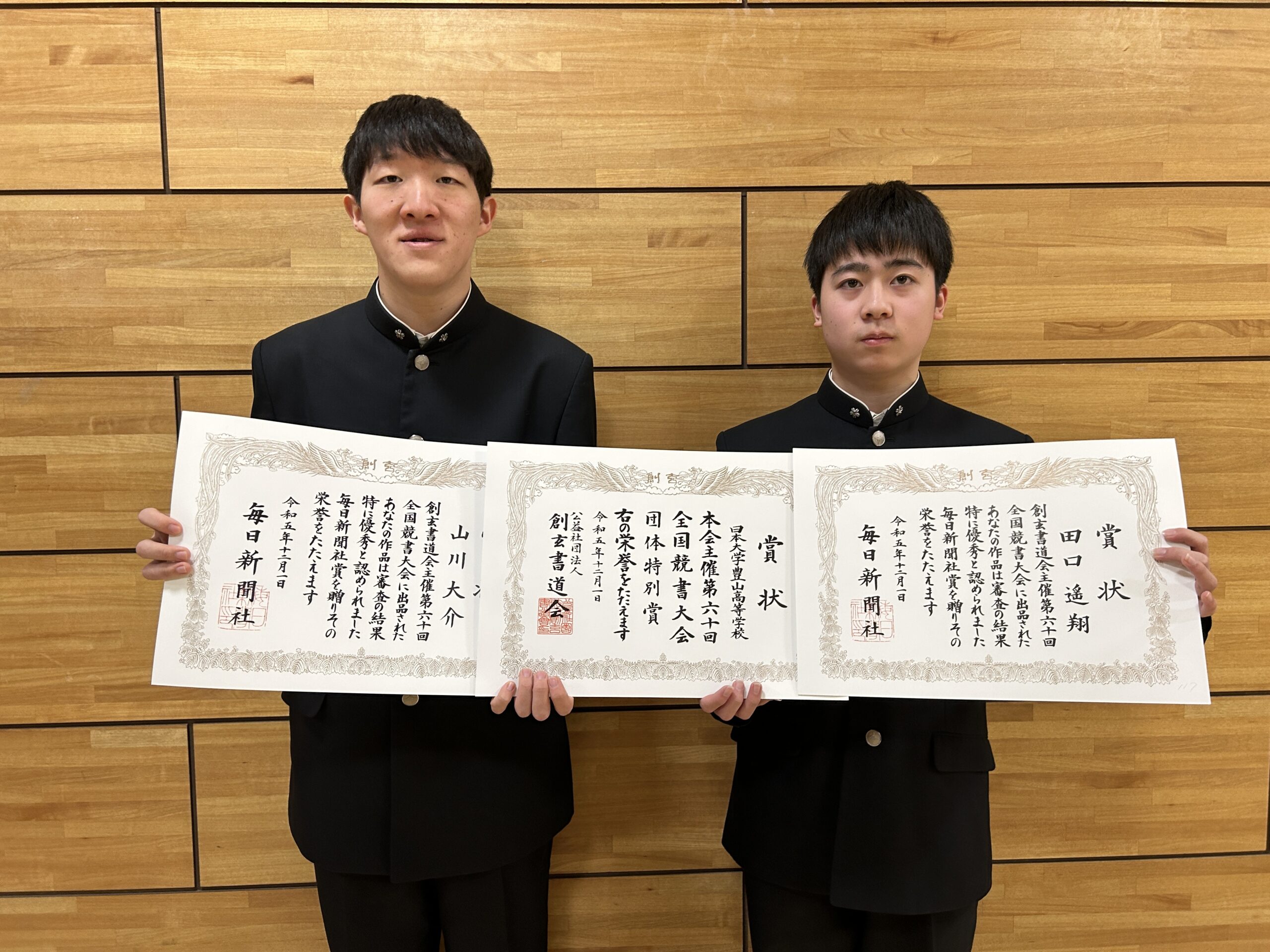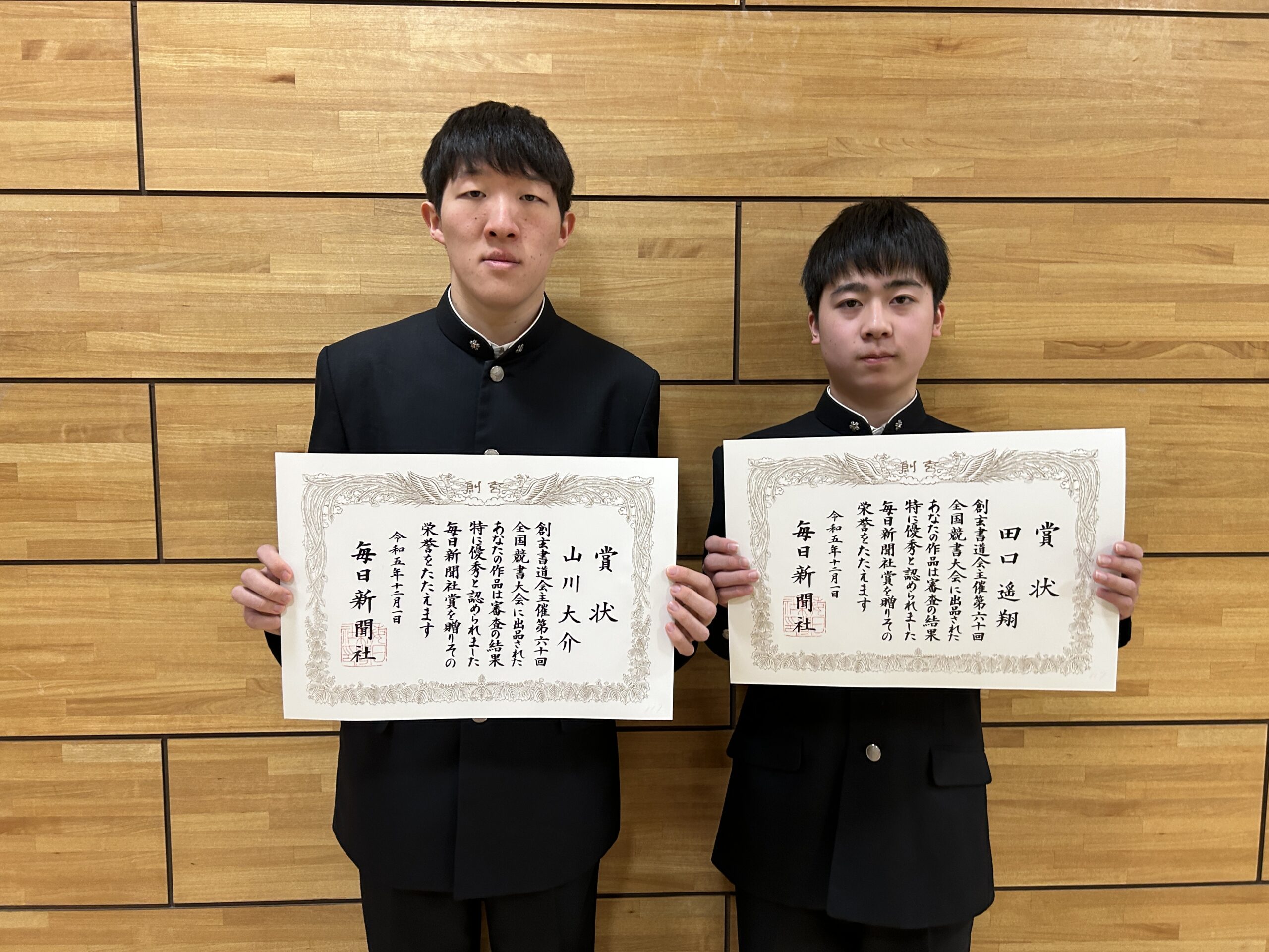 全国競書大会は、例年30,000点を超える力作が集まるレベルの高い大会です。本校書道部の2名がそんな競書大会で、特別賞である「毎日新聞社賞」を受賞しました。また、本校の「書道教育への取り組み」も評価され、学校として「団体特別賞」も受賞しました。