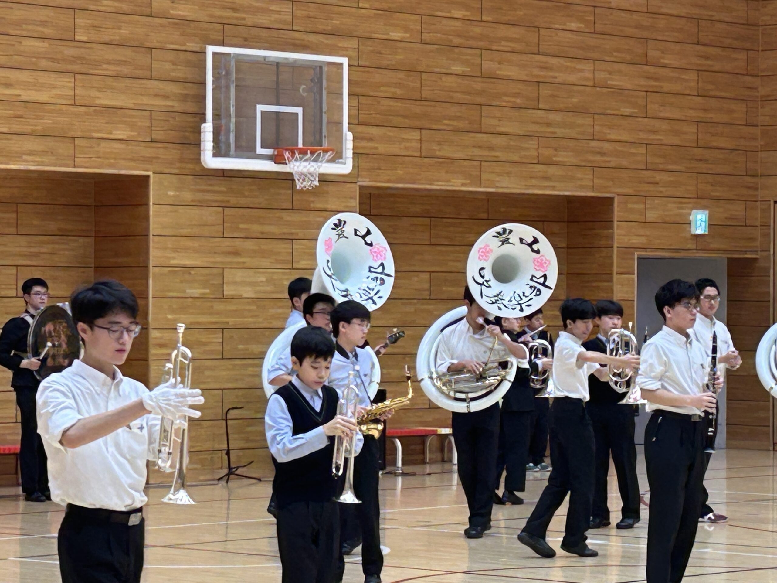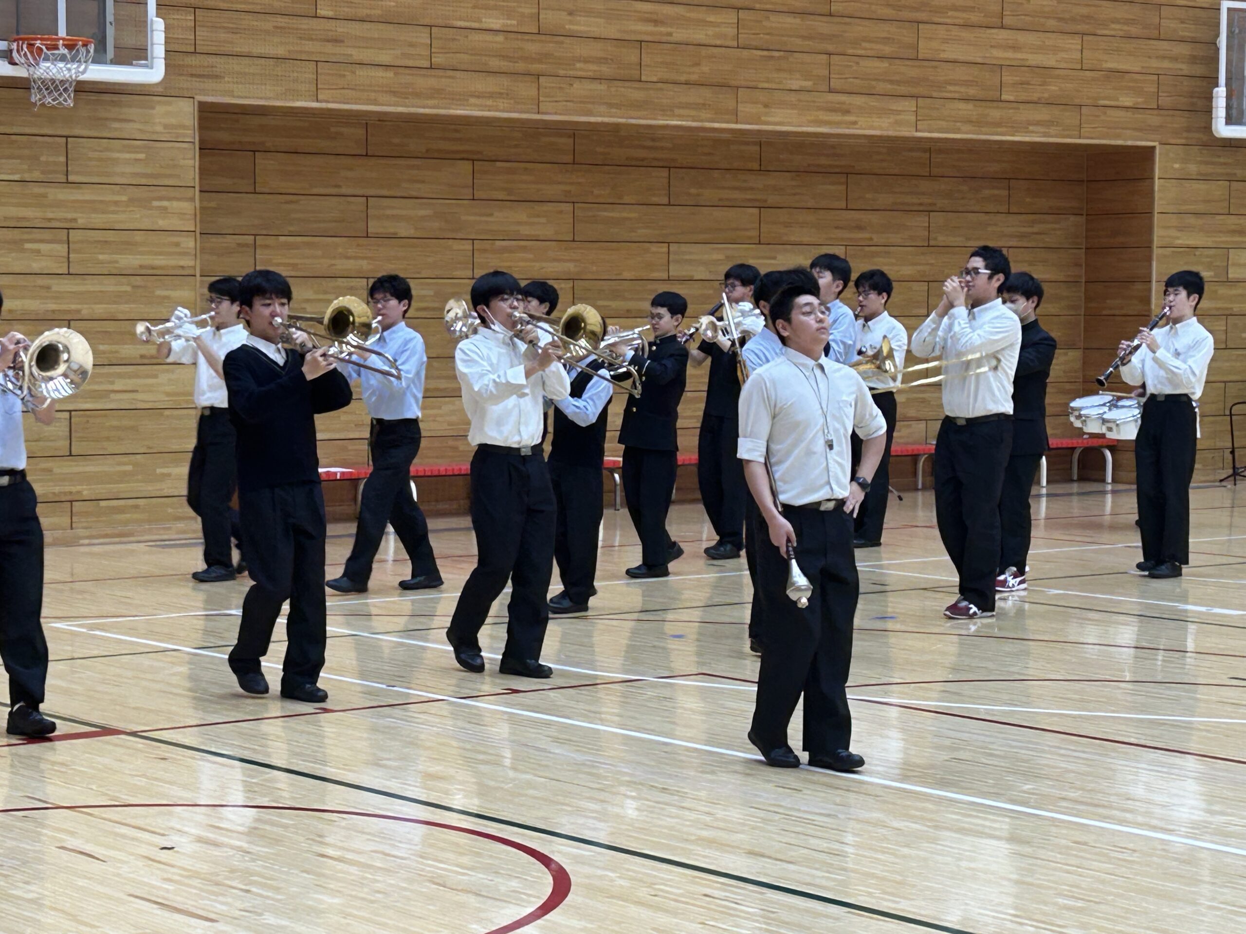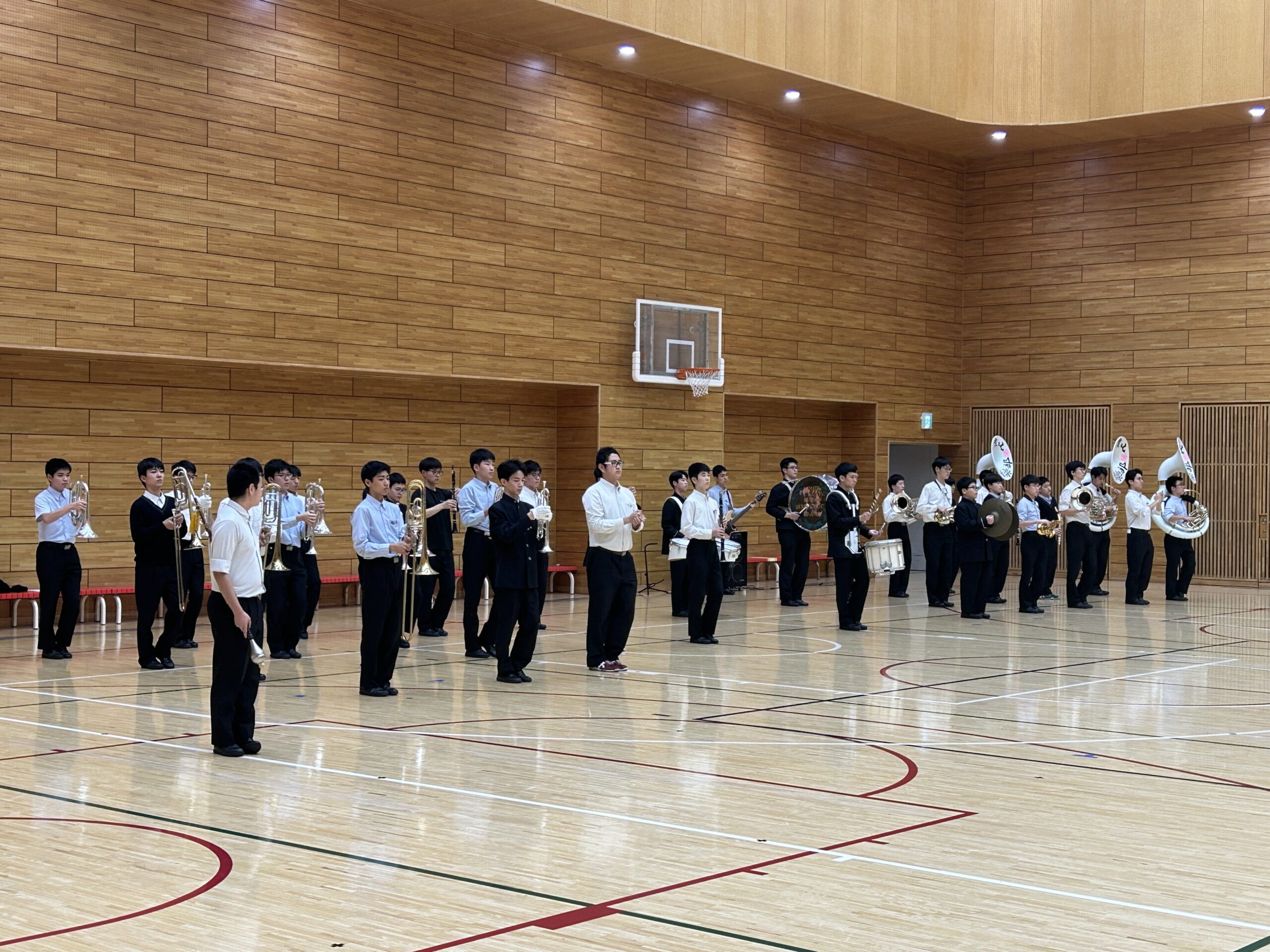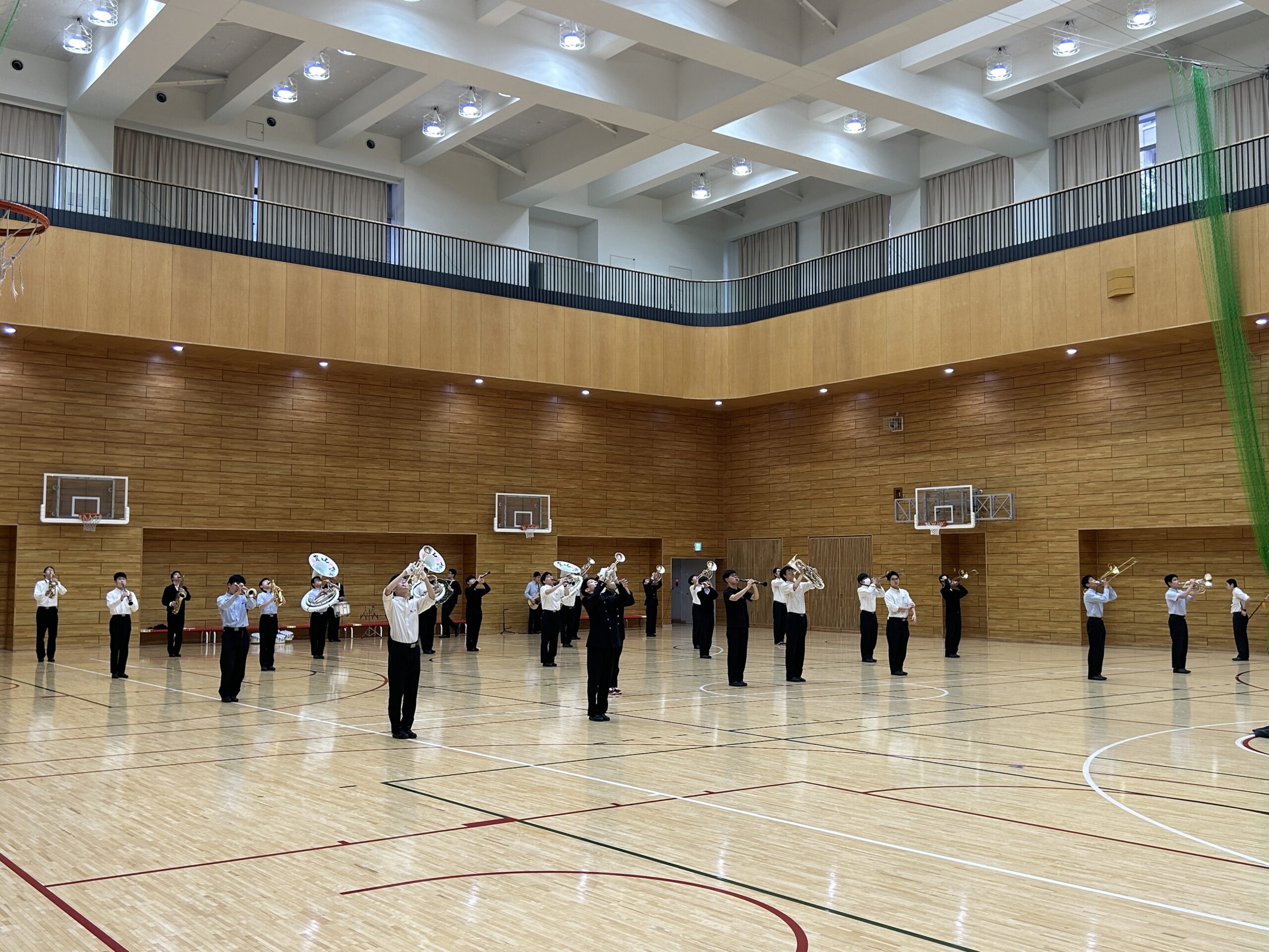 吹奏楽部はアリーナでドリル演奏の練習をしています。気合の入った演奏に期待!!
