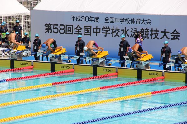 本日は400mフリーリレーの決勝が行われ、本校中学水泳部が