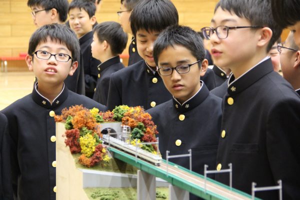 鉄道部のジオラマに興味津々な生徒たち