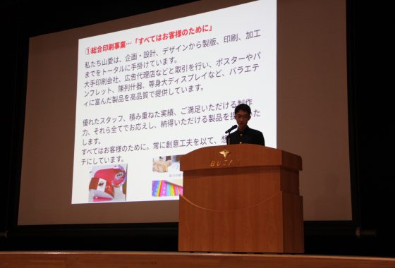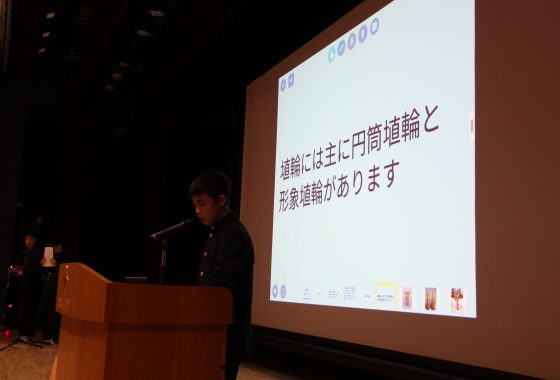 タブレットを用いてまとめたものを,各クラスの代表者が全校生の前で発表しました。