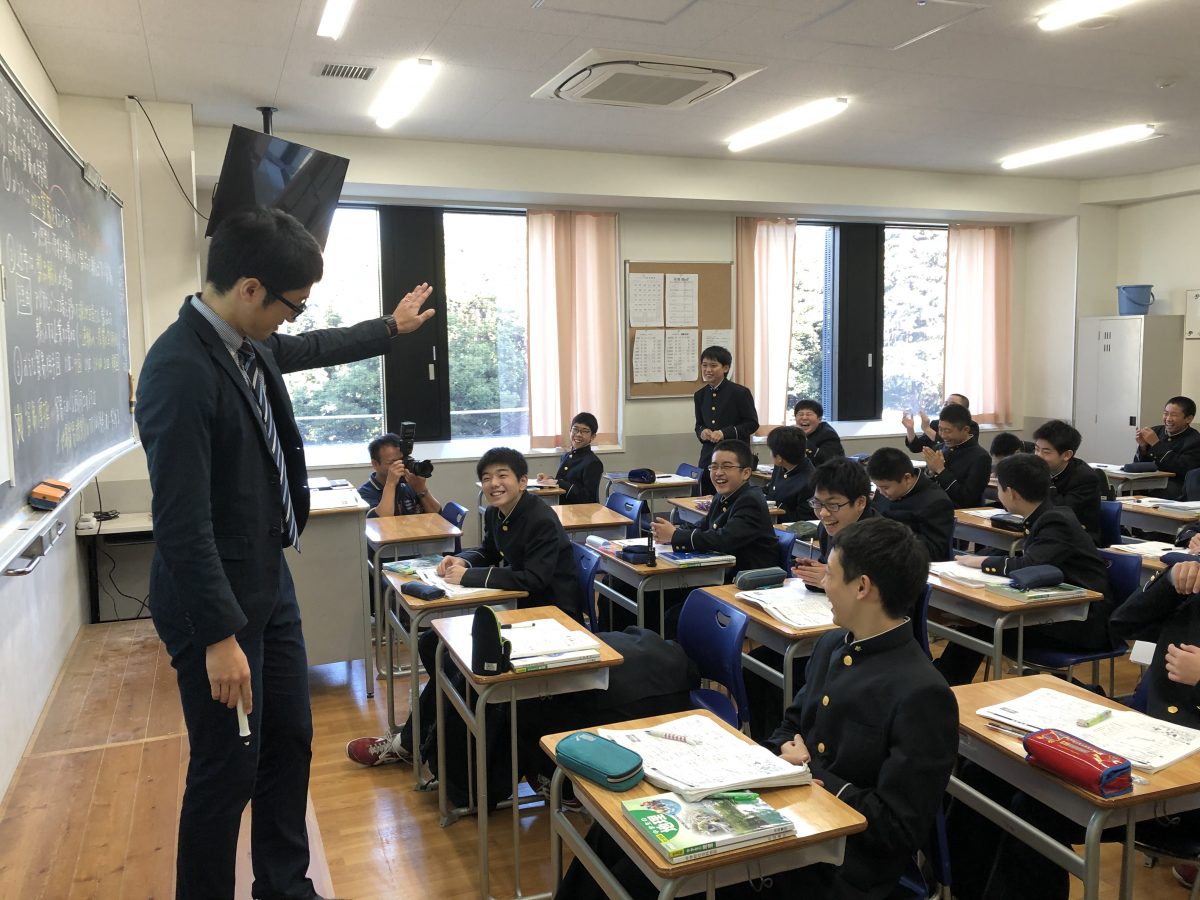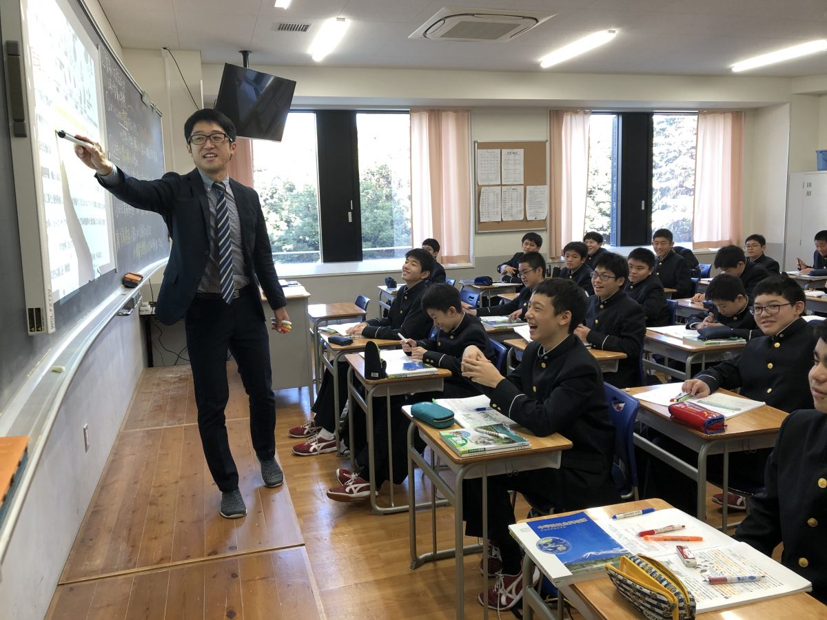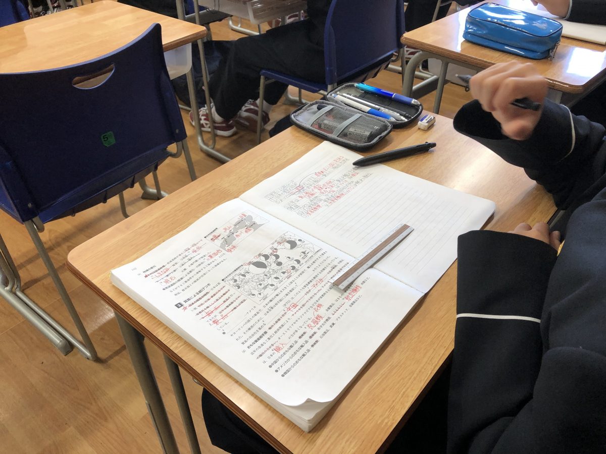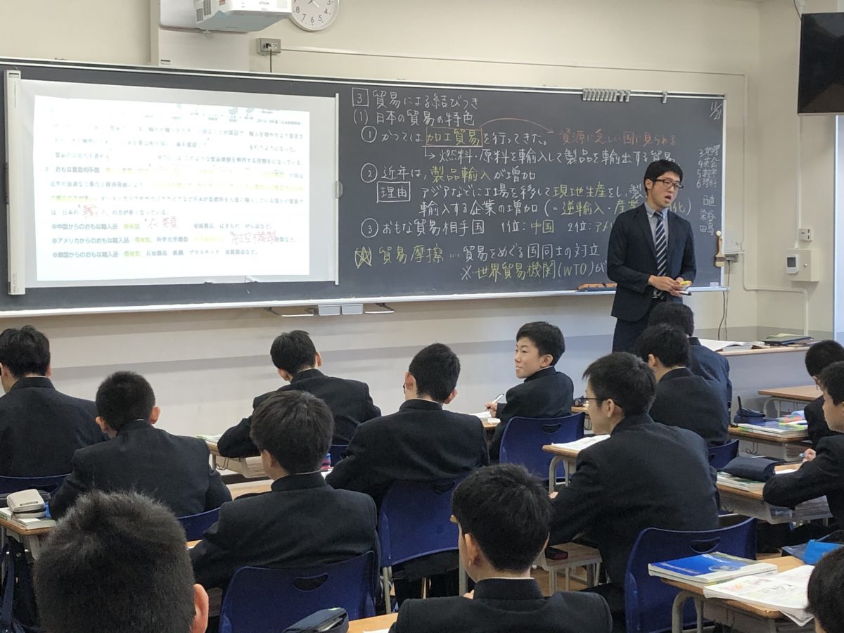 世界貿易について、中学1年生が学んでいます。ボーダーレスな時代に生きるみなさんにとっては大切な知識。積極的に手があがります。