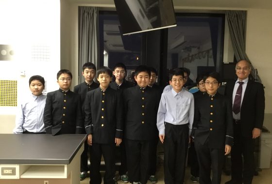 本校9階にある理科室では,中学理科部の部員が校長先生とともに月食を観察していました。