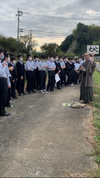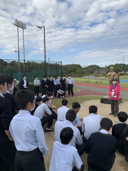 また、益城町には復興支援の一環として、アニメ『ONE PIECE』のキャラクターであるサンジの像が設置してあります。生徒たちは嬉しそうに写真撮影をしておりました。