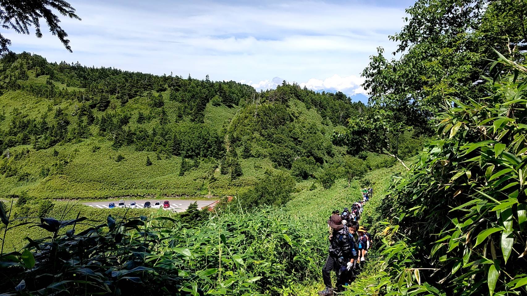 本日も午後から天候不良との予報のために赤石山への登山予定を変更し、笠ヶ岳への登山となりました。夜中に降った雨の影響で地面に泥濘もあり、部員達も悪戦苦闘していました。その中でも、「ここ滑るから気をつけて」「右から通ったほうがいいよ」などといったことを後方に伝えて、連携を図りながら進む姿に、成長を感じました。