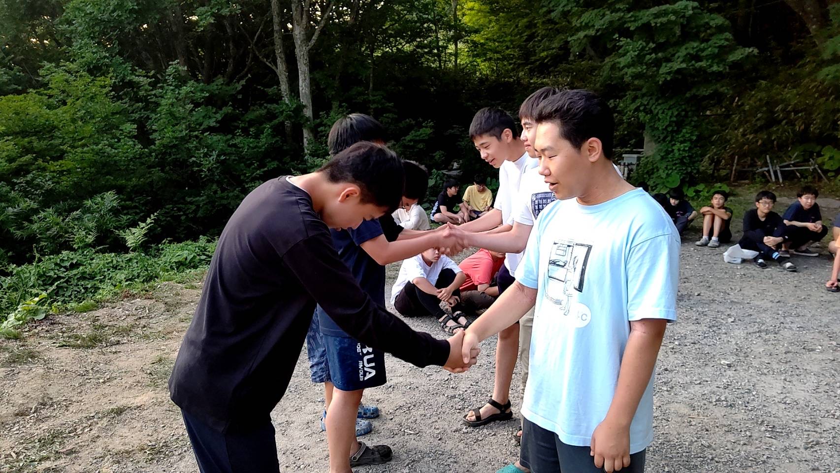 下山してホテルに戻り、夕方からは恒例のバーベキューです。初めての火起こし器に悪戦苦闘しながらも、一生懸命に取り組んでいました。バーベキューの後にはスイカ割りで親睦を深め、最後に中学3年生の引退式を行いました。これからは中学2年生が部を引っ張っていく姿に期待です。
