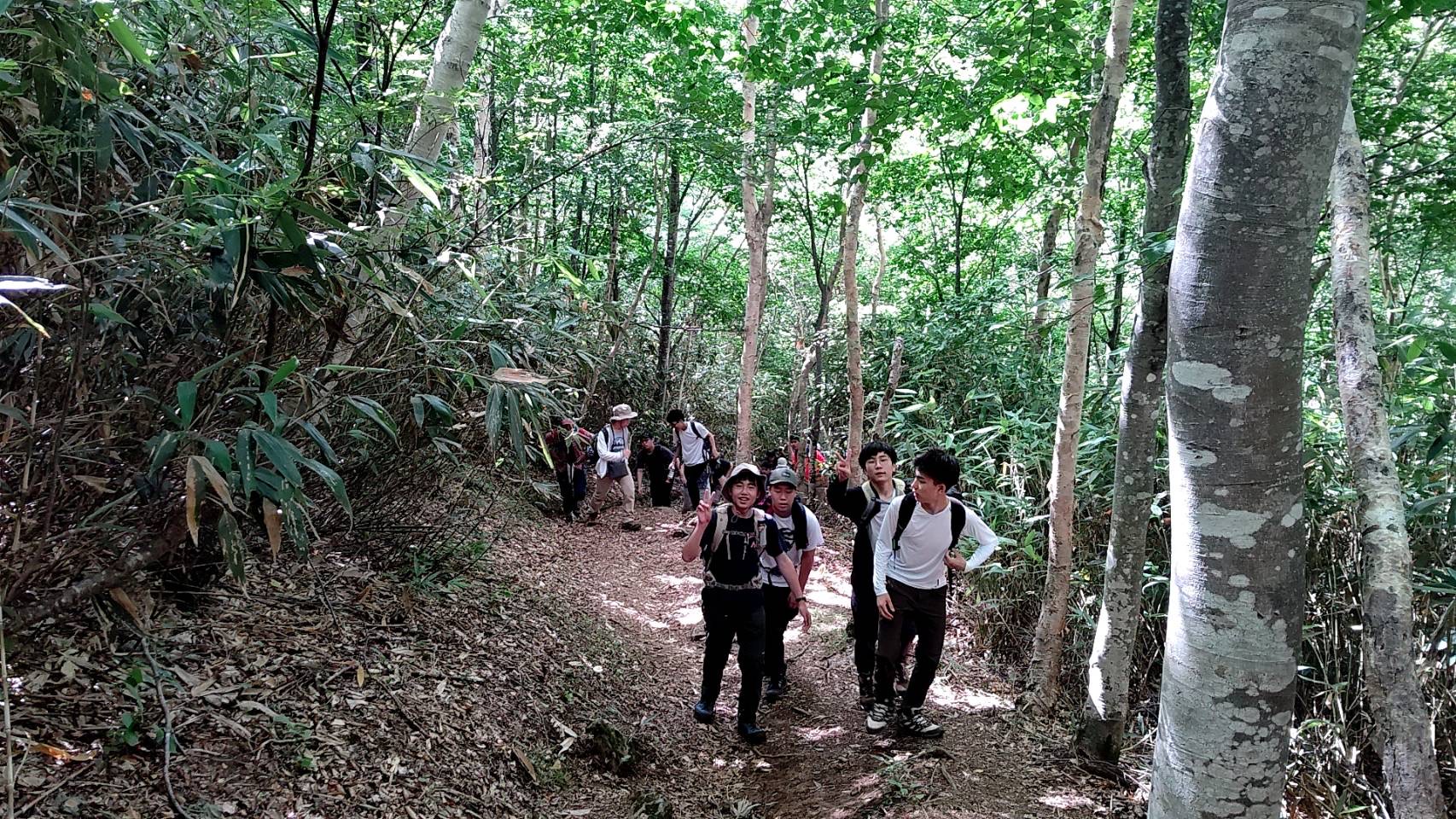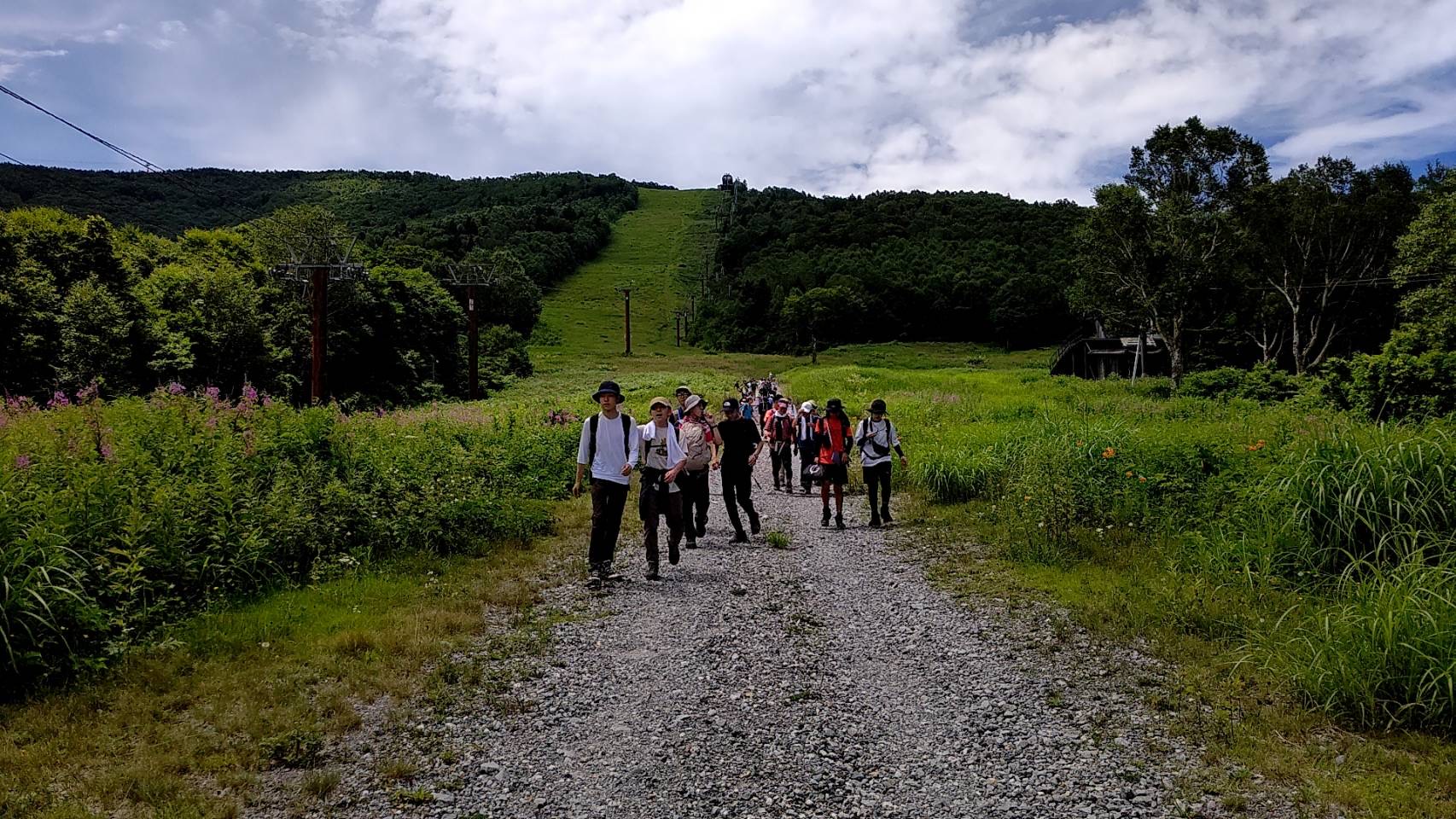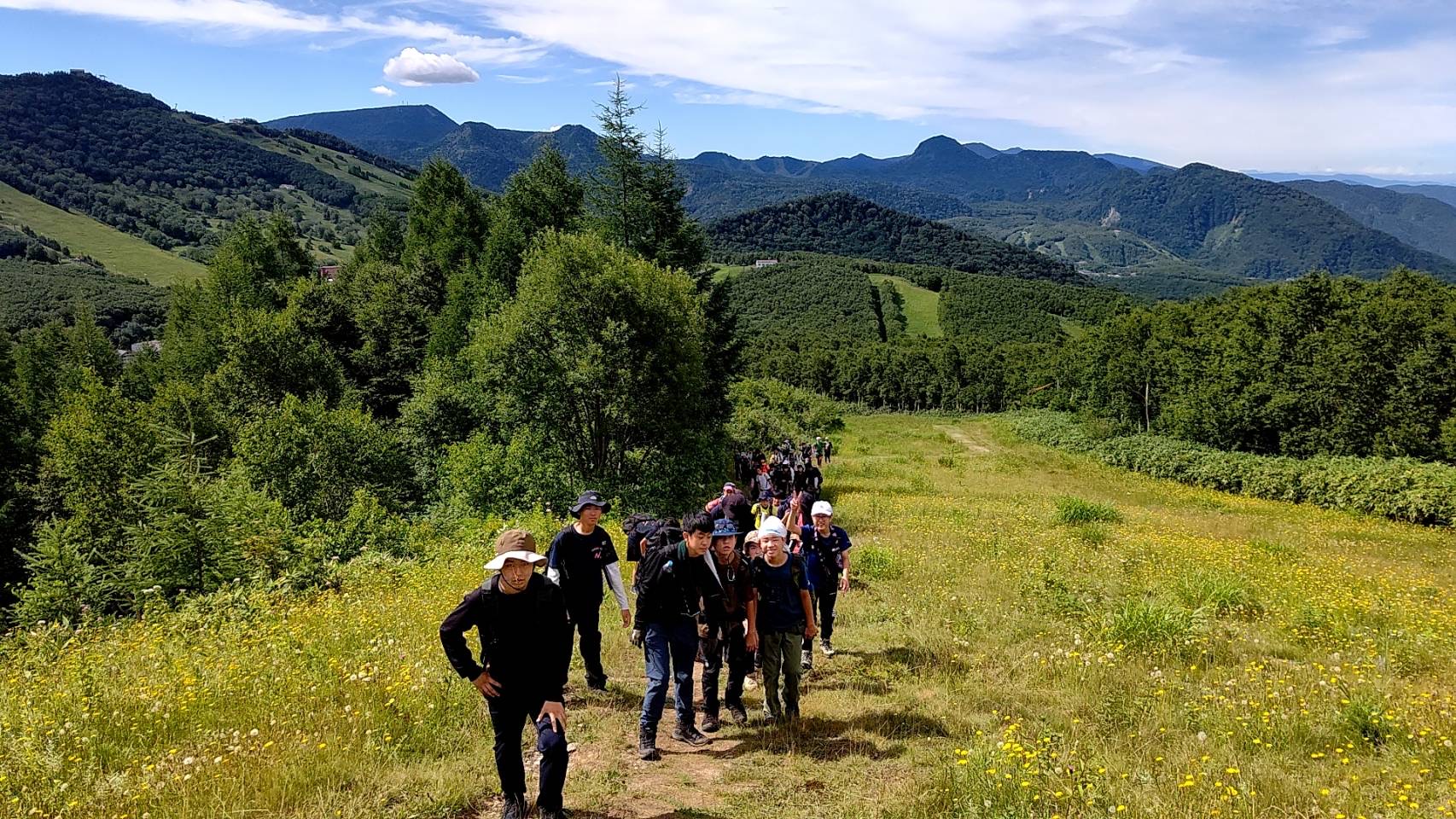 本日は予定通り、焼額山に登りました。昨日とはうってかわって泥濘もなかったのですが、スキー場のゲレンデを歩いているときには厳しい表情を見せていました。こまめに休憩を挟みながら、部員同士で励まし合いながら到達した山頂の景色は、それは素晴らしいものでした。
