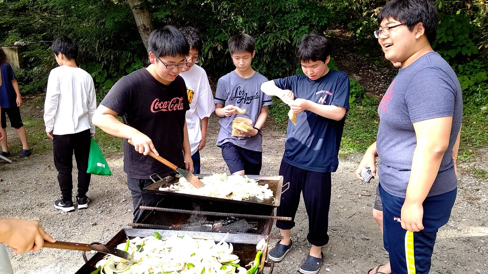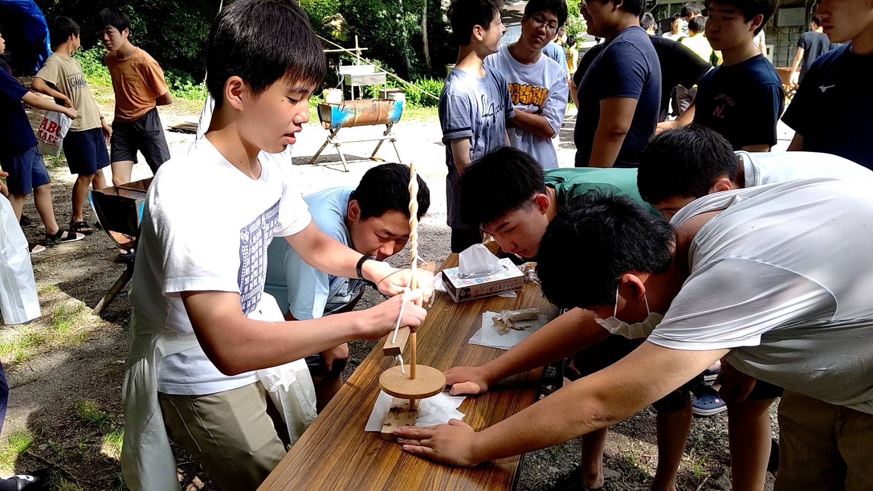 下山してホテルに戻り、夕方からは恒例のバーベキューです。初めての火起こし器に悪戦苦闘しながらも、一生懸命に取り組んでいました。バーベキューの後にはスイカ割りで親睦を深め、最後に中学3年生の引退式を行いました。これからは中学2年生が部を引っ張っていく姿に期待です。