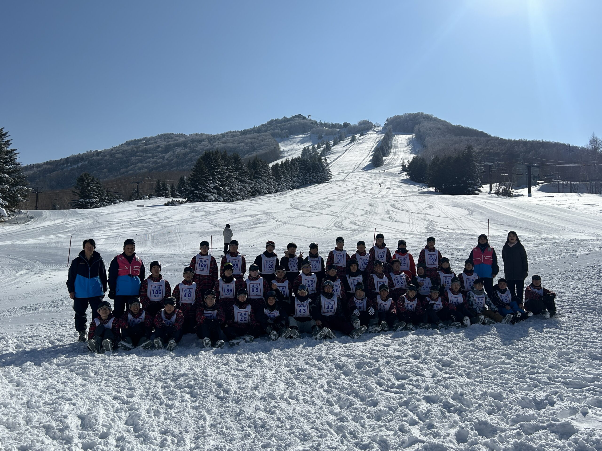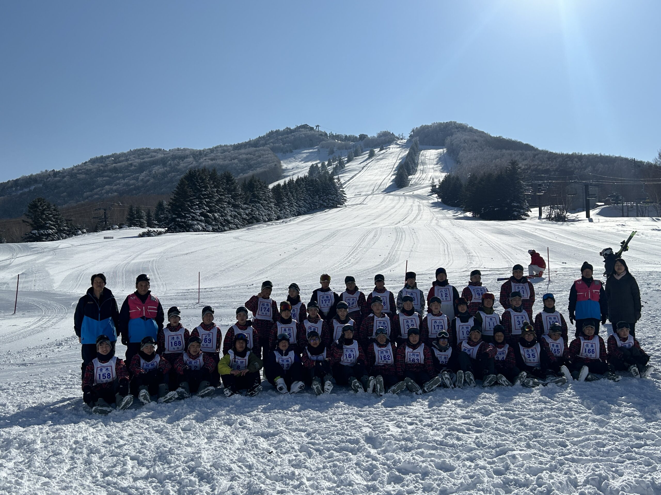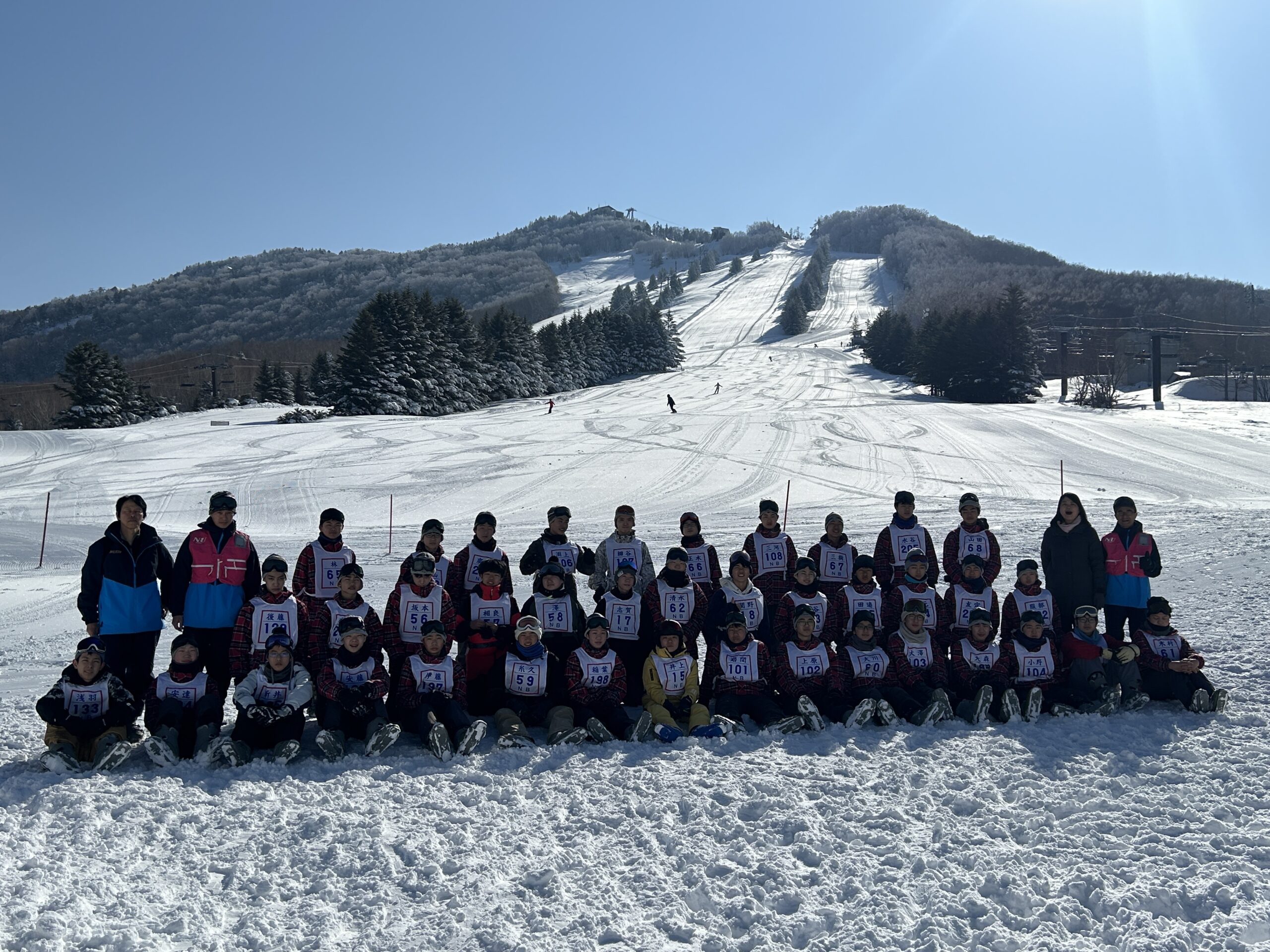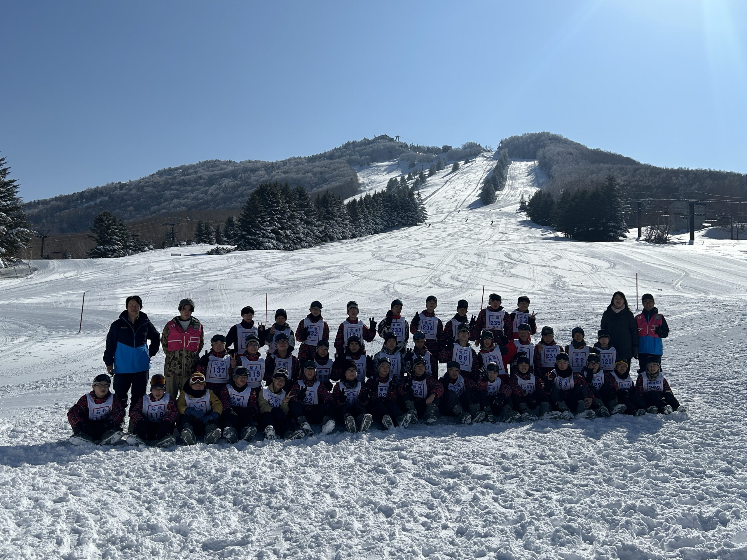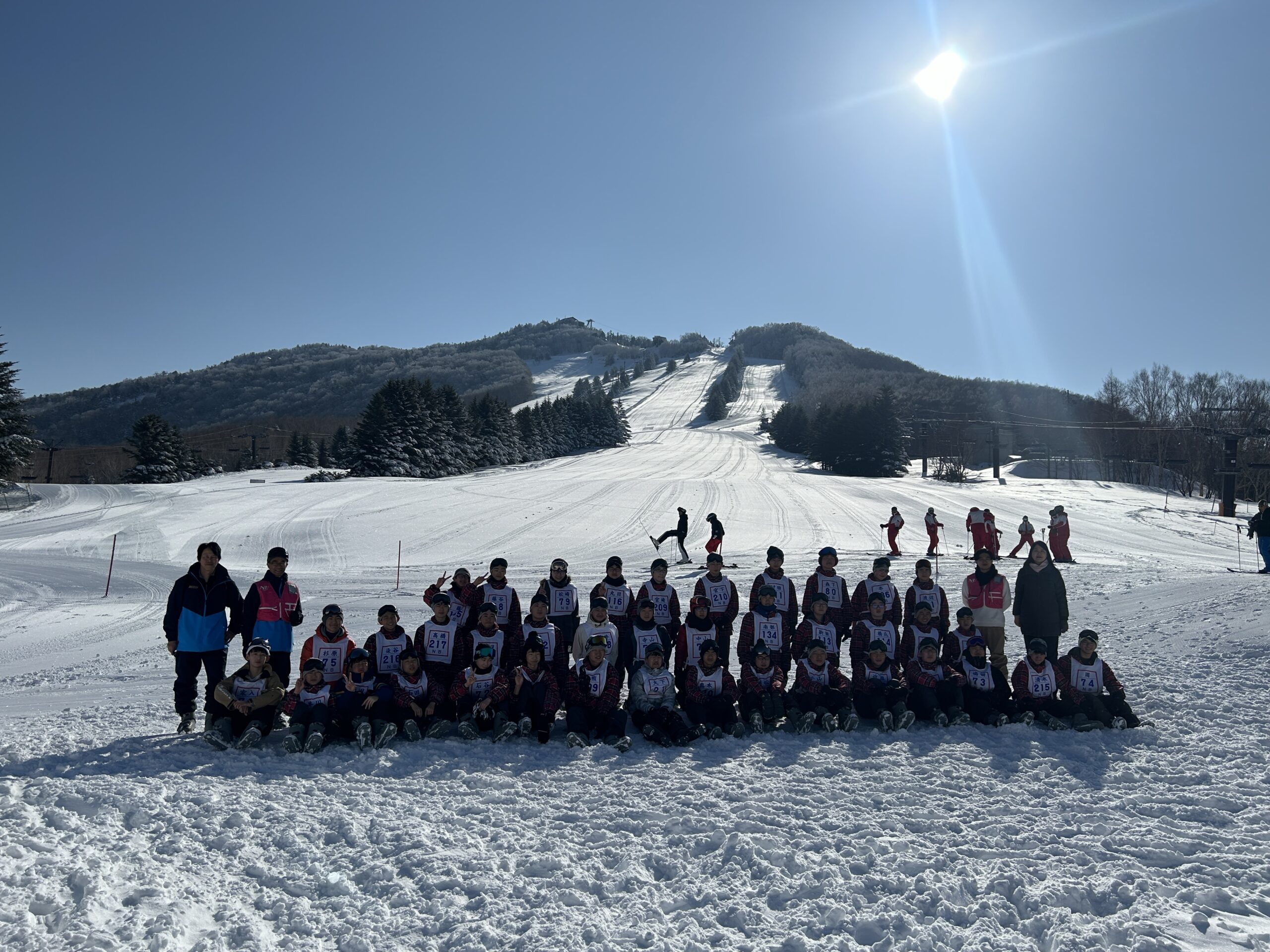 スキー教室2日目は集合写真の撮影から。ゲレンデは快晴の空が広がっています。