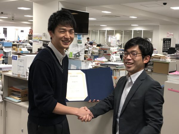 高校3年の坂入君が大学主催のスピーチコンテストで入賞を果たしました。