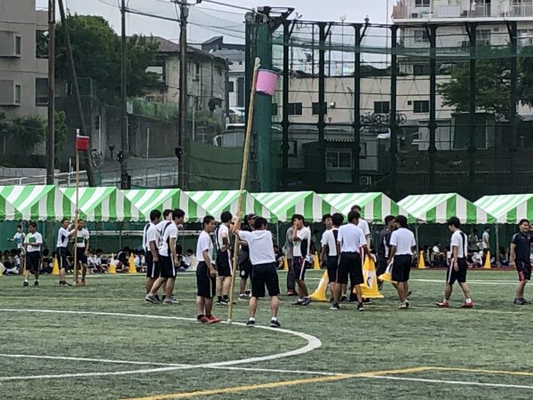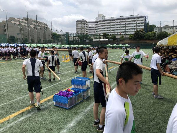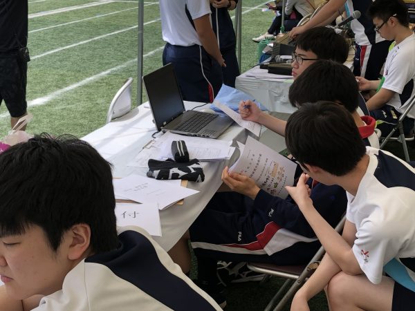 人工芝のグラウンドはすっかり乾きました。現在、プログラムは午前中の半ばに差し掛かりました。この競技を支えている生徒たちの様子を見てみましょう。彼らの活躍によって体育大会は運営されています。