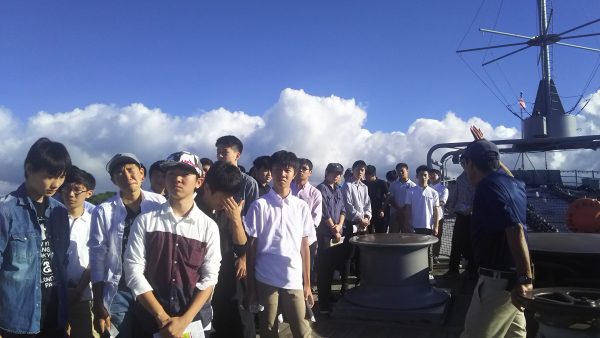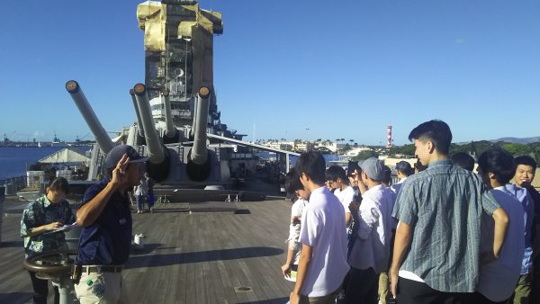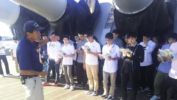 1班の4日目午前は、パールハーバーにて平和学習です。まずは、第2次世界対戦の終戦の際の調印式が行われた、戦艦ミズーリにて、終戦に至る歴史を学習しました。次に、航空博物館に移動し、様々な航空機を見学しました。生徒は真剣に話を伺っていました。平和について、真剣に考える時間になったかと思います。