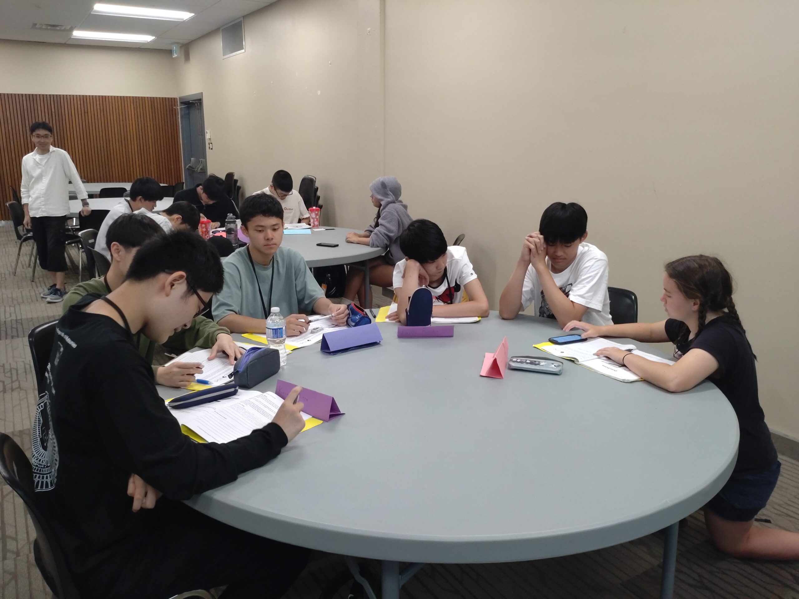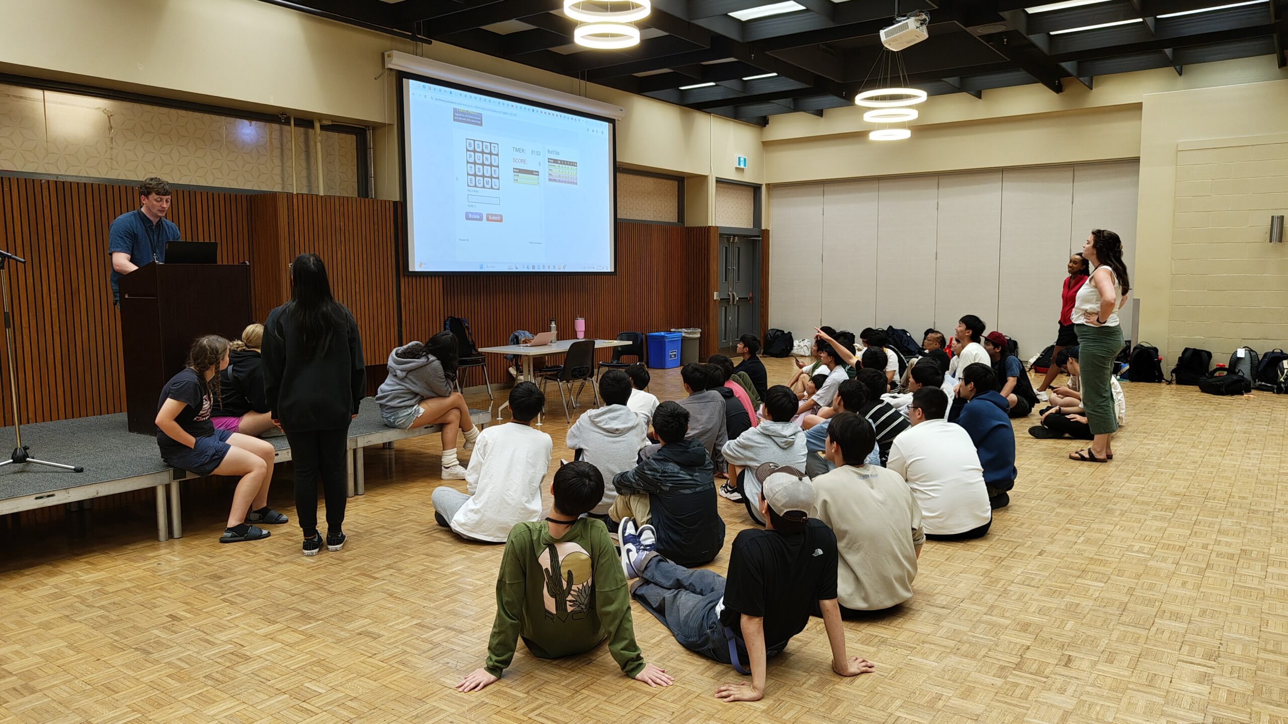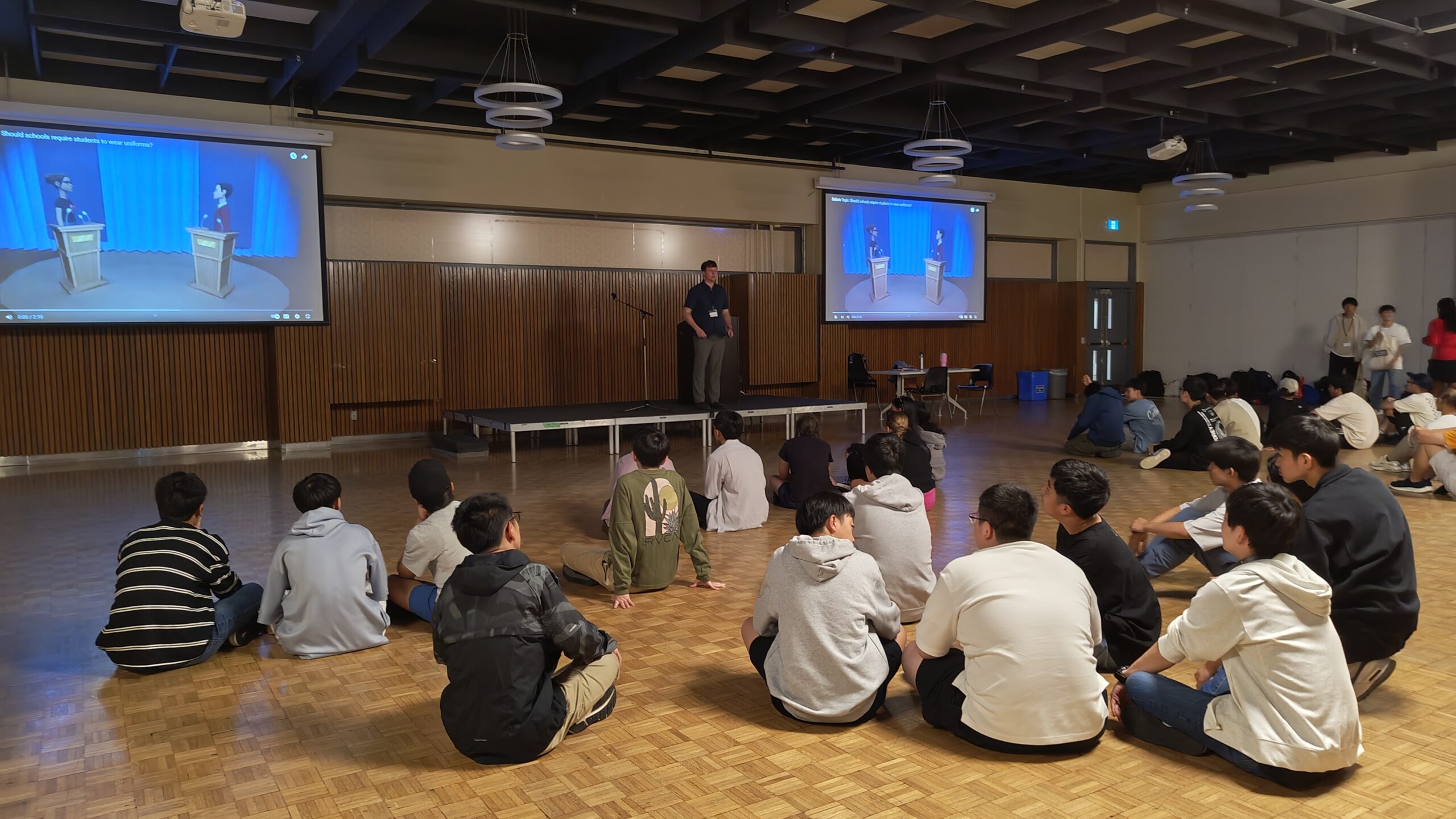 午後はTeam Debatingです。まず、16文字のアルファベットを使って単語を作ってポイントを競うミニゲームを行いました。最初は24ポイントでしたが、何回か繰り返すうちに生徒もコツをつかんできて、最終的には100ポイントを超えていました。ちなみに、生徒からの希望でゴードン先生1人でチャレンジしてもらったところ、404ポイントとハイスコアを記録して、みんな大盛り上がりでした。
