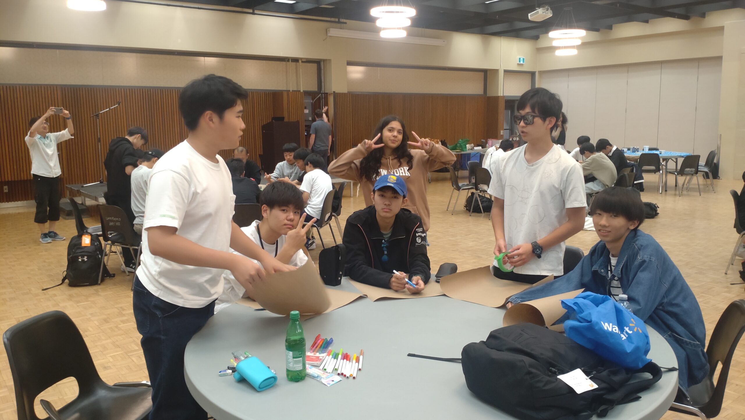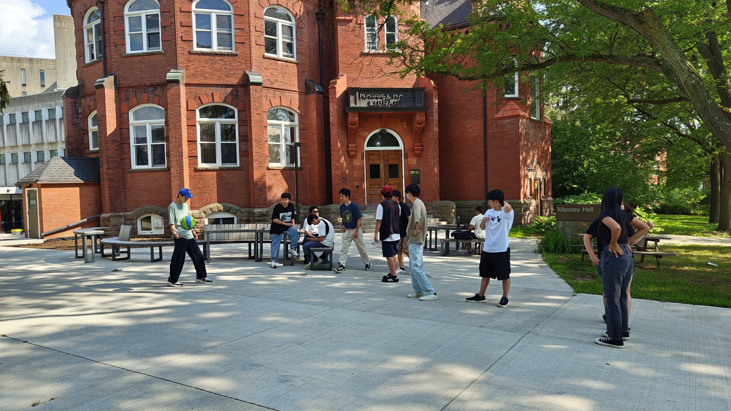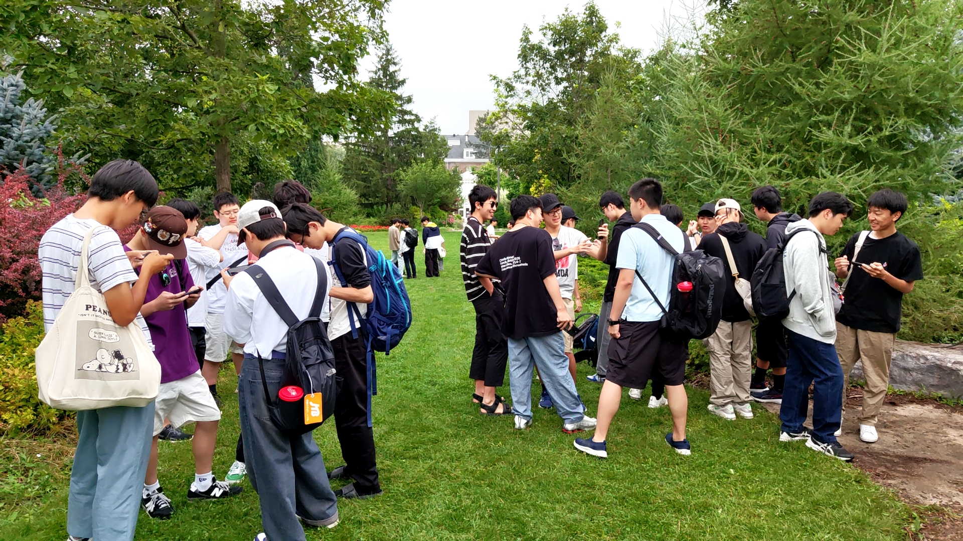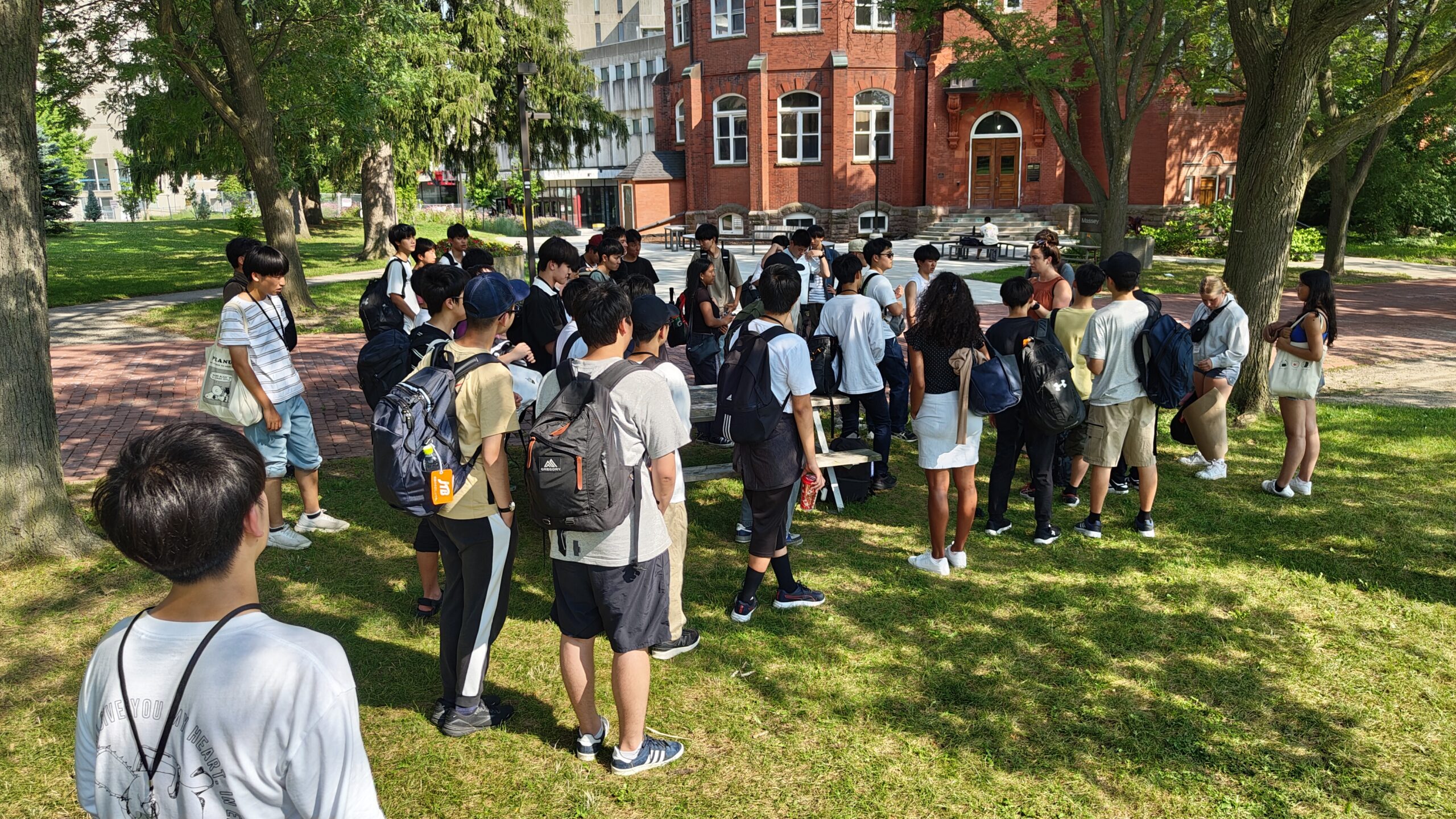 午後は、マットゲーム(毎朝やっている同じポーズをしたら負けというゲーム)、午前中の授業内容の振り返りを行い、その後メモリアルアートを作成しました。カナダに来て印象に残った風景や動物などを1人1枚の大きめの紙に描きます。それぞれの想いが込められていて、どれも素晴らしいです。その後、フェアウェルセレモニーで歌う、カナダ国歌と豊山校歌を練習し、外の広場でバスケットボールやフリスビー、キックベースなどを楽しみました。こうやってグエルフ大学の広場で体を動かすのは、これで最後。広い芝生を堪能していました。