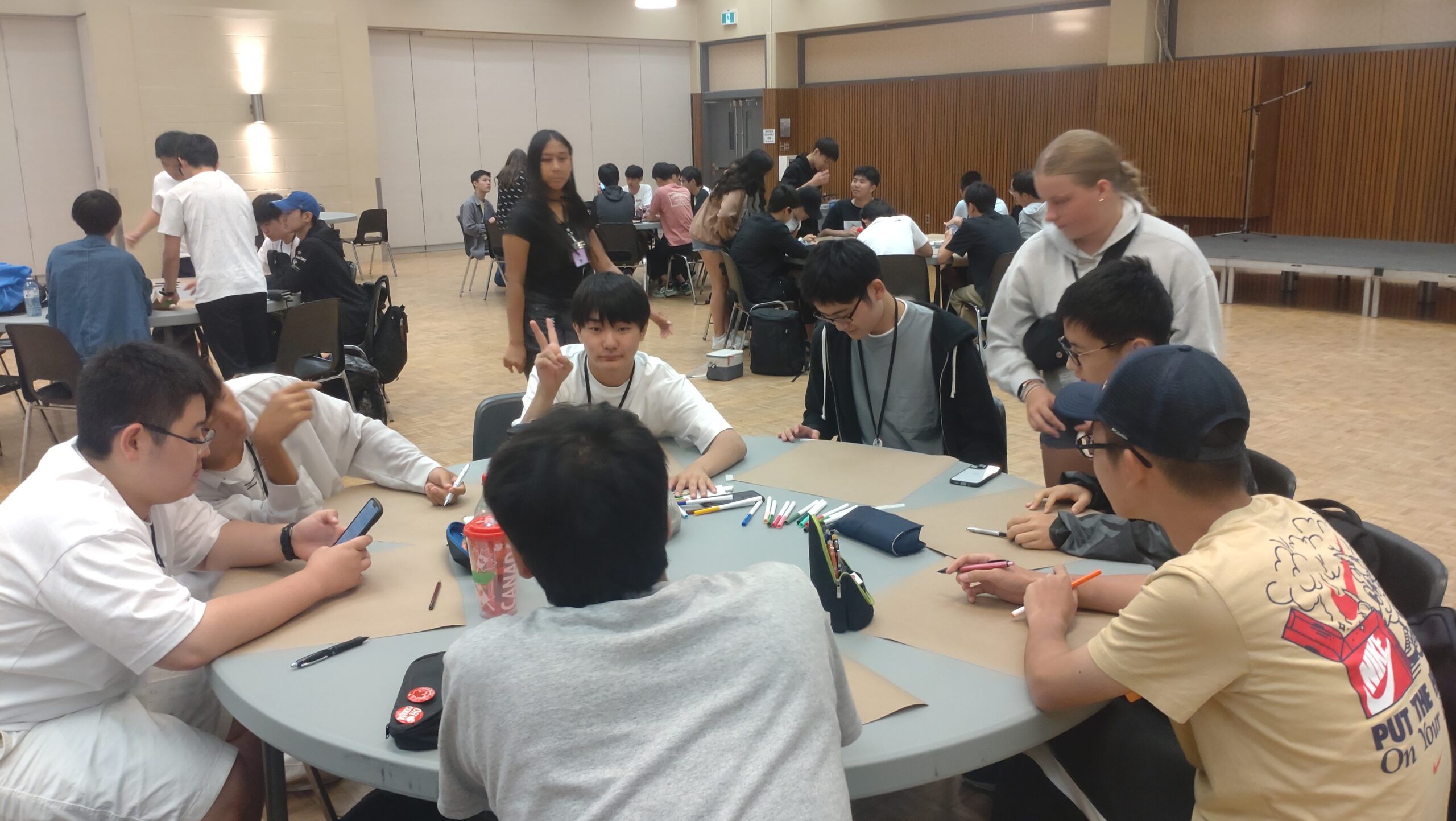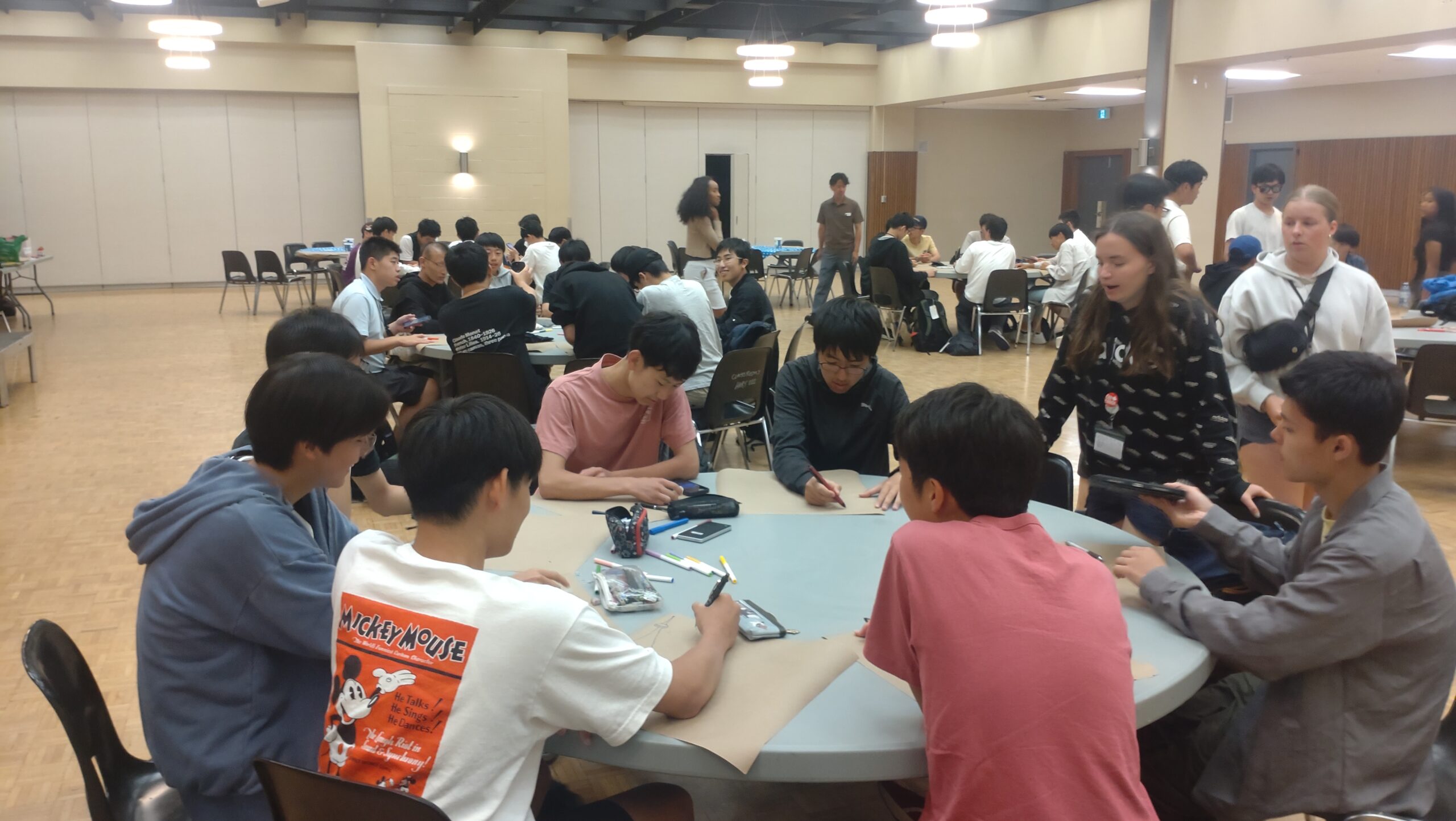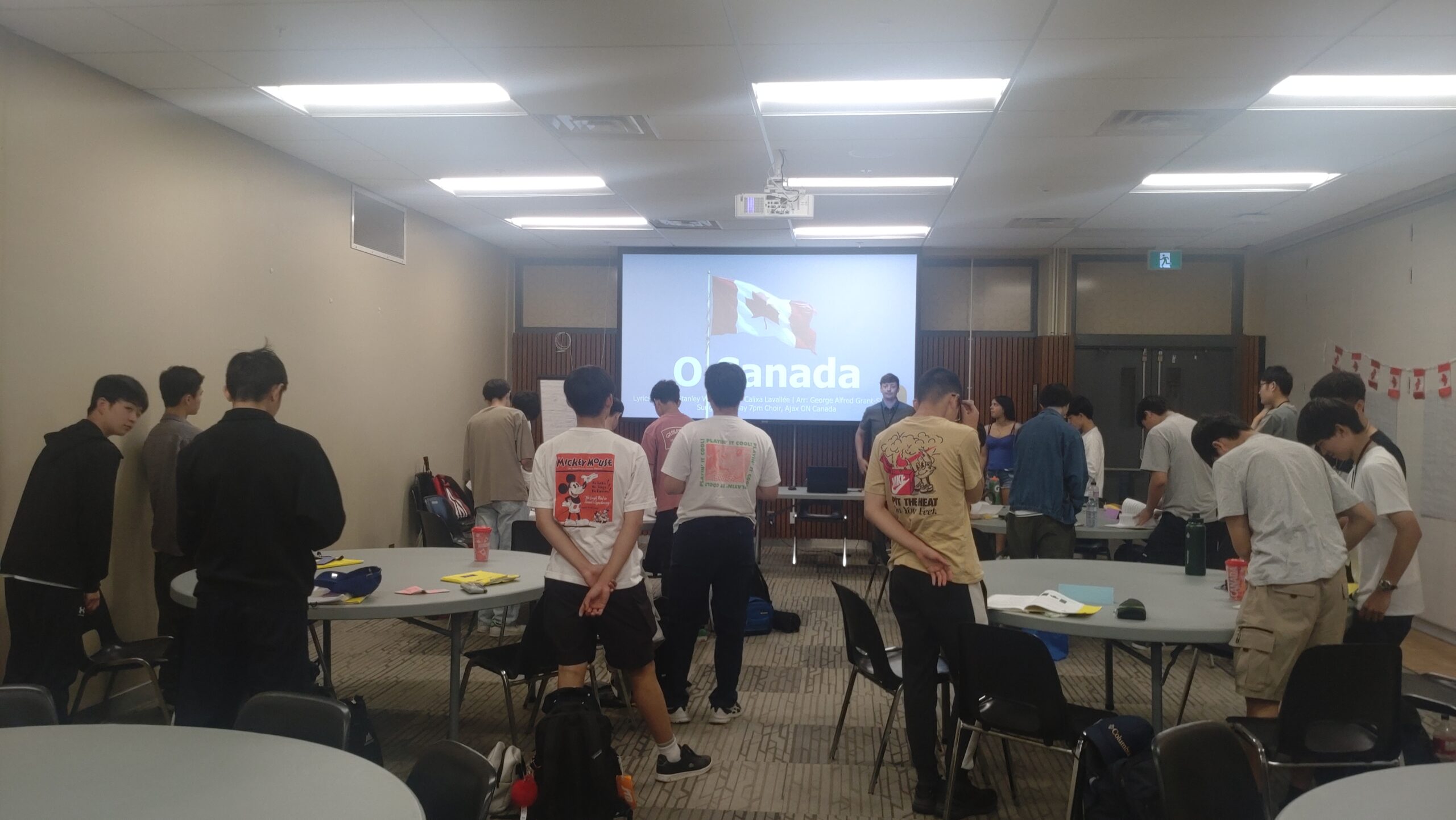 午後は、マットゲーム(毎朝やっている同じポーズをしたら負けというゲーム)、午前中の授業内容の振り返りを行い、その後メモリアルアートを作成しました。カナダに来て印象に残った風景や動物などを1人1枚の大きめの紙に描きます。それぞれの想いが込められていて、どれも素晴らしいです。その後、フェアウェルセレモニーで歌う、カナダ国歌と豊山校歌を練習し、外の広場でバスケットボールやフリスビー、キックベースなどを楽しみました。こうやってグエルフ大学の広場で体を動かすのは、これで最後。広い芝生を堪能していました。