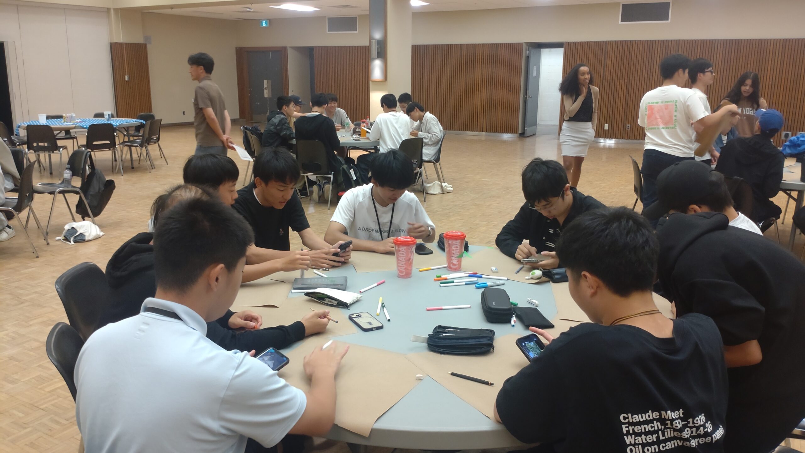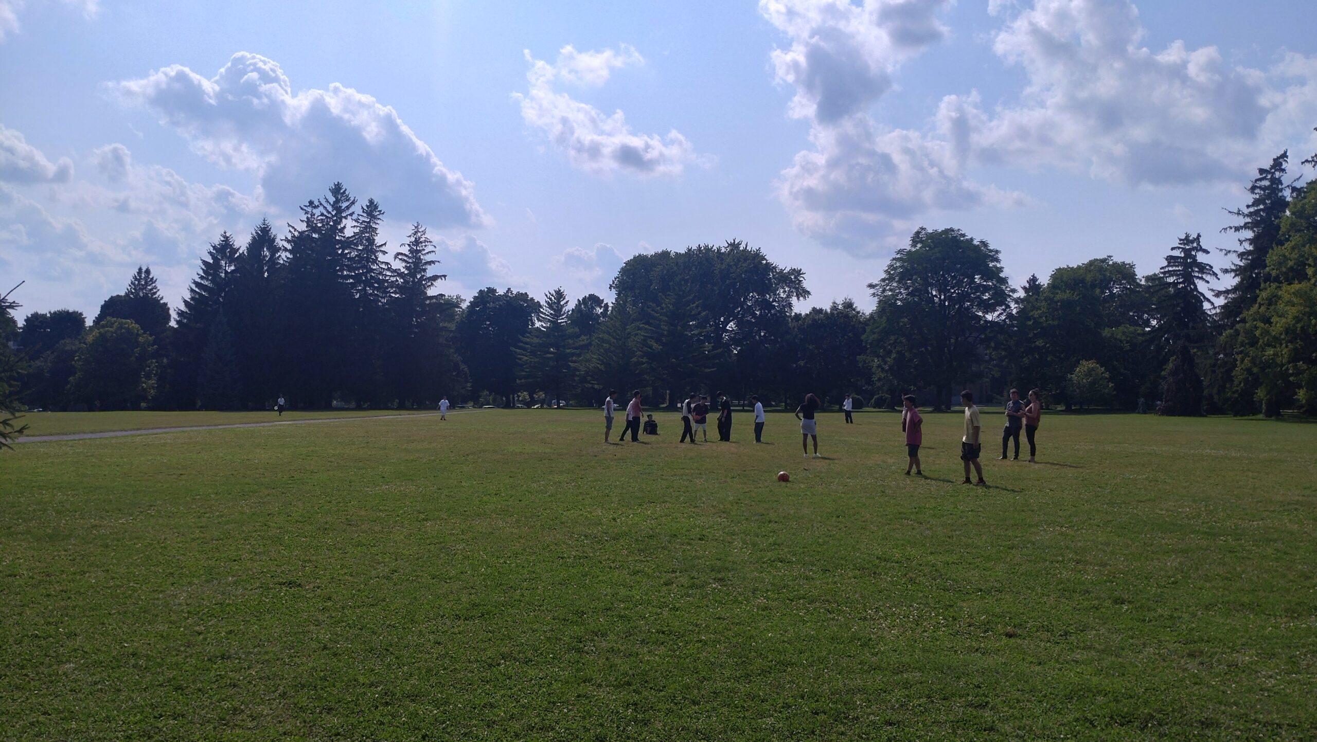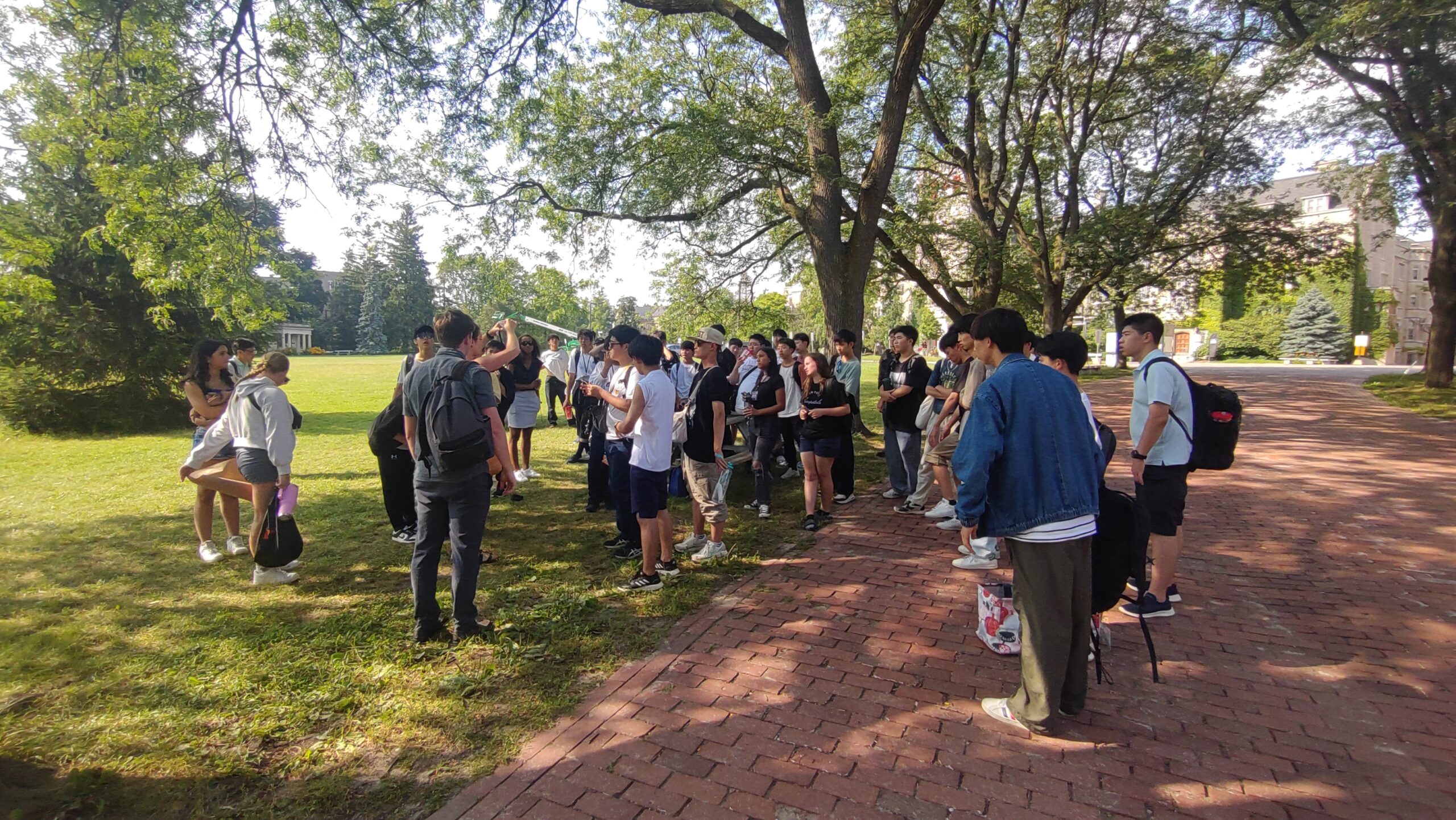午後は、マットゲーム(毎朝やっている同じポーズをしたら負けというゲーム)、午前中の授業内容の振り返りを行い、その後メモリアルアートを作成しました。カナダに来て印象に残った風景や動物などを1人1枚の大きめの紙に描きます。それぞれの想いが込められていて、どれも素晴らしいです。その後、フェアウェルセレモニーで歌う、カナダ国歌と豊山校歌を練習し、外の広場でバスケットボールやフリスビー、キックベースなどを楽しみました。こうやってグエルフ大学の広場で体を動かすのは、これで最後。広い芝生を堪能していました。