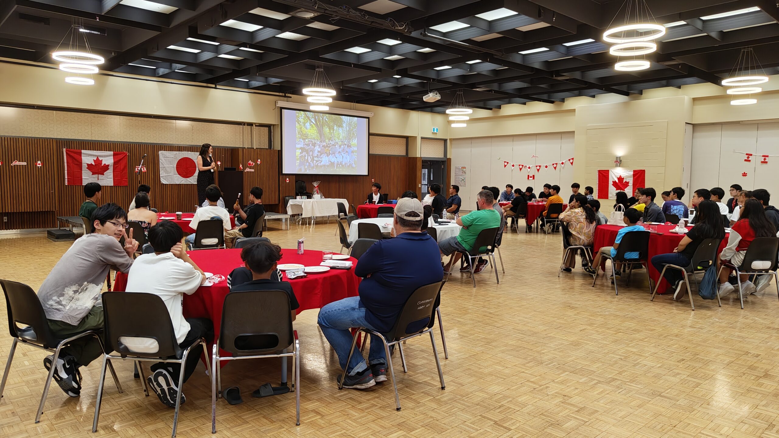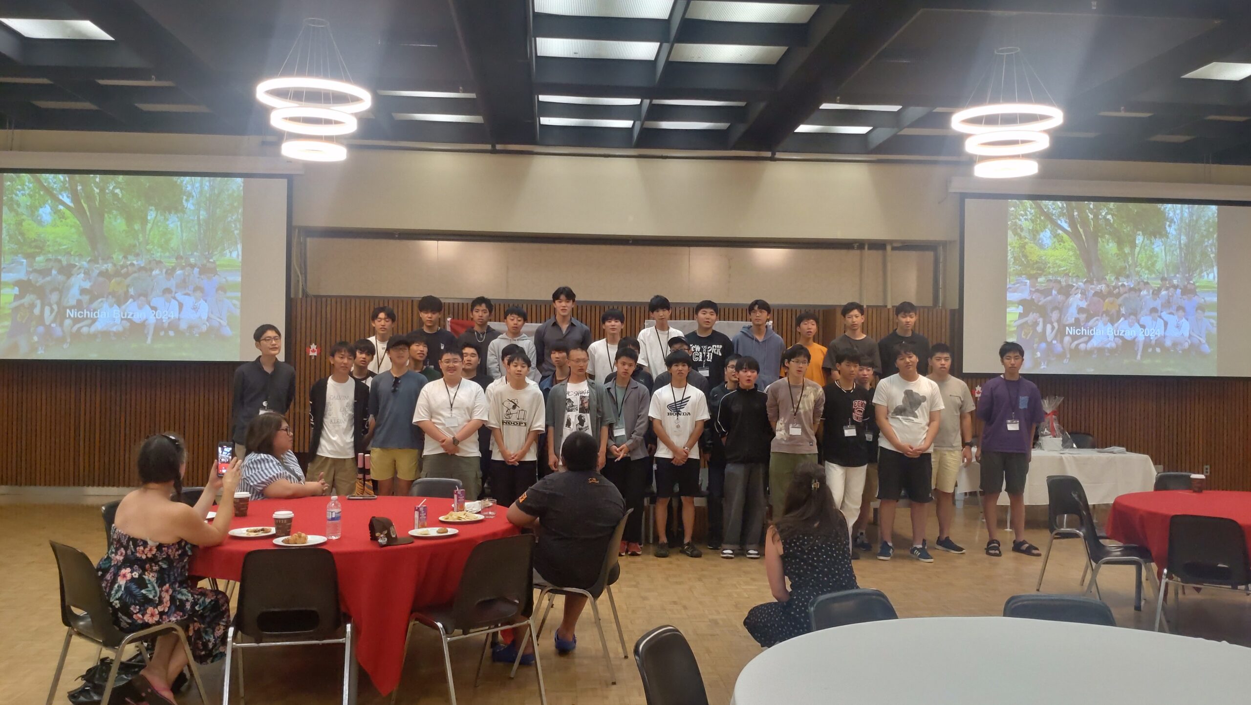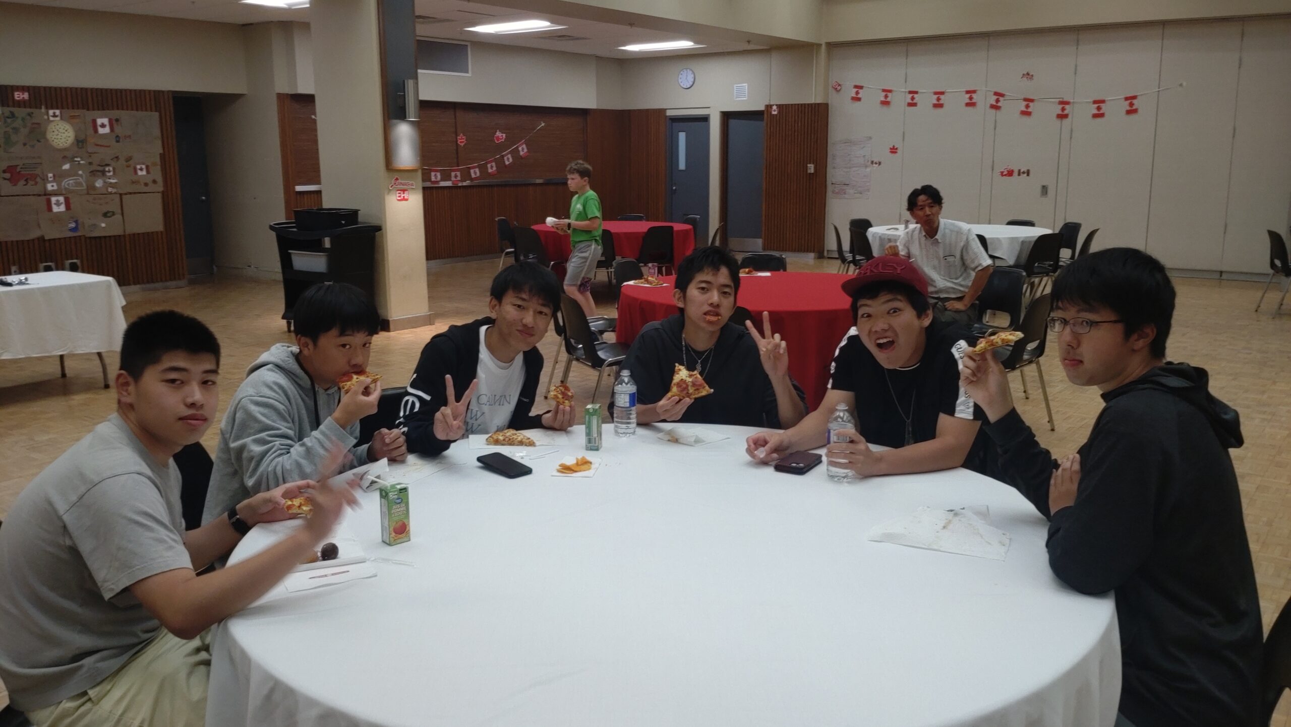 ピザが届いて、生徒たちはまず食事です。パイナップルピザはカナダでは人気ですが、豊山生にはちょっと不人気でした。空腹を満たしたら、そろそろホストファミリーが到着する時間です。ここからは生徒に自主的に動いてもらい、会を進めていきます。到着したホストファミリーを会場までエスコートしておもてなし。家庭の事情で来られないホストファミリーもいらっしゃいましたが、参加者全員がそろった18時頃、フェアウェルセレモニーがスタートしました。