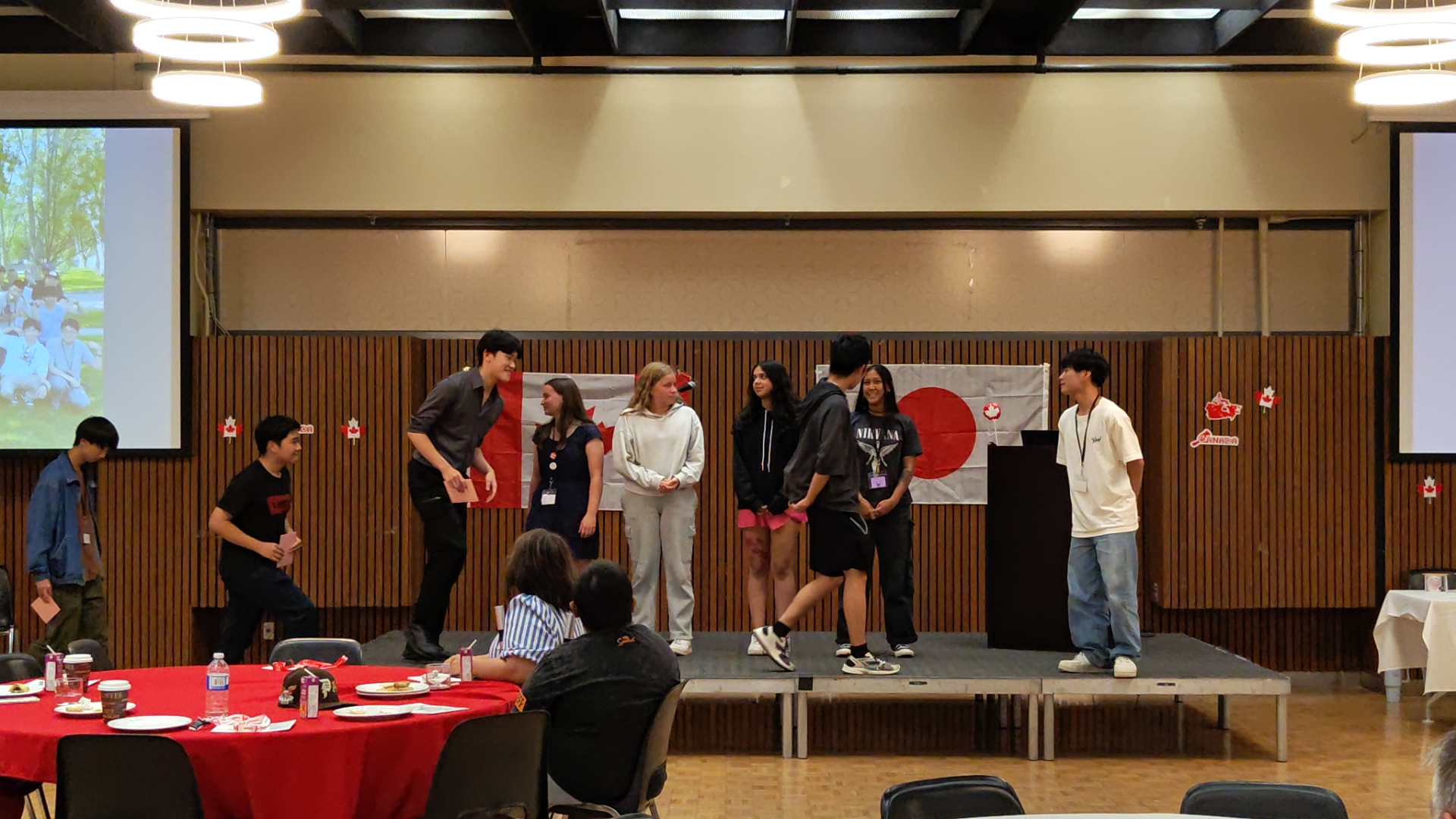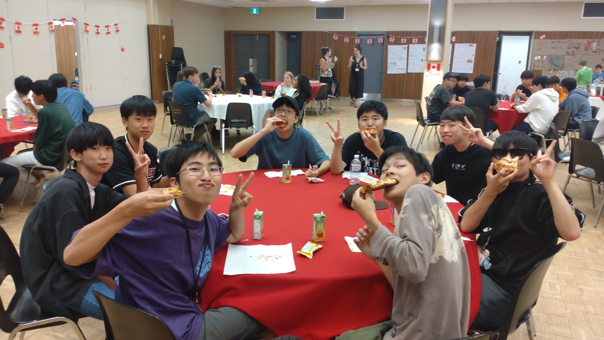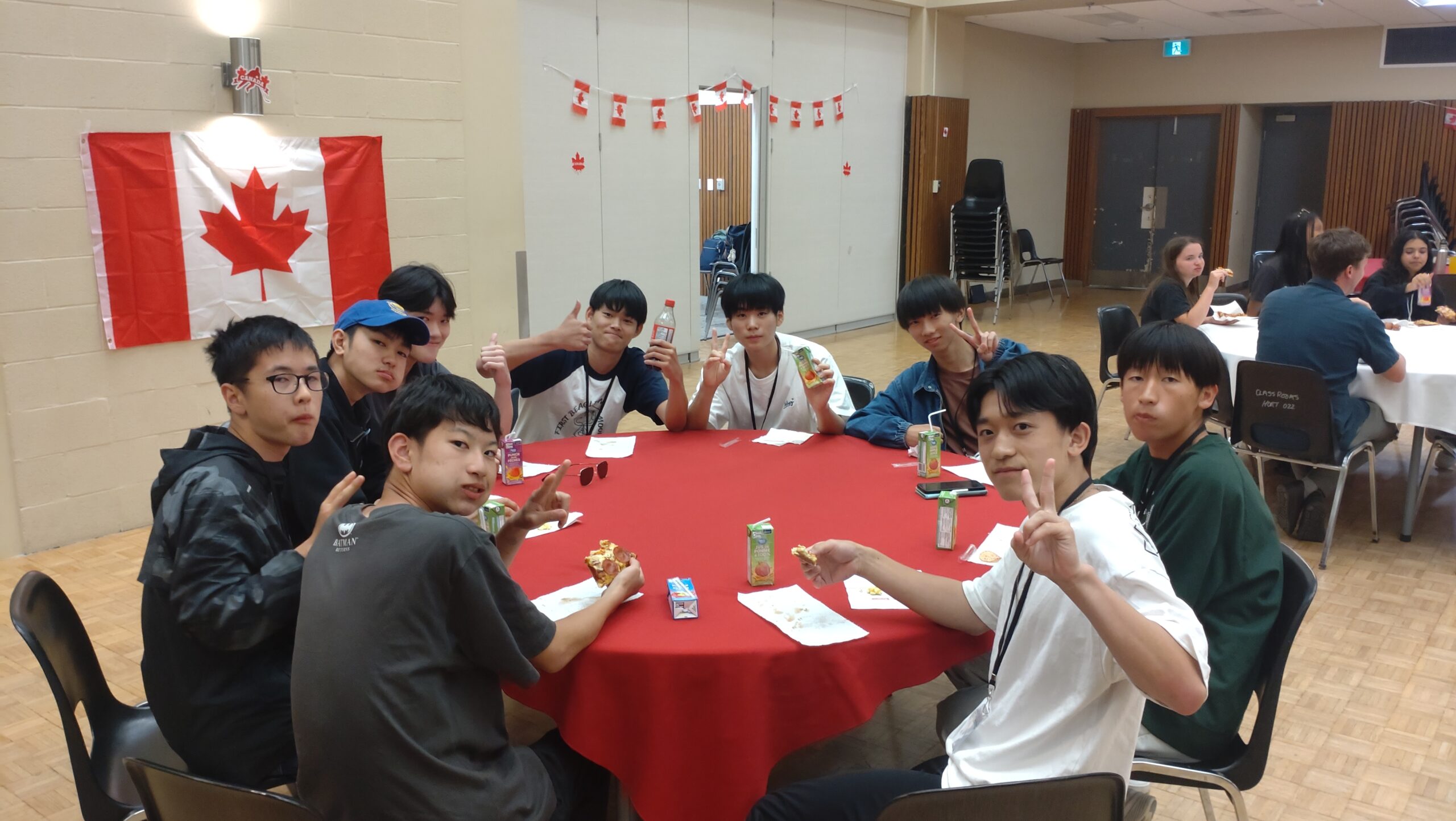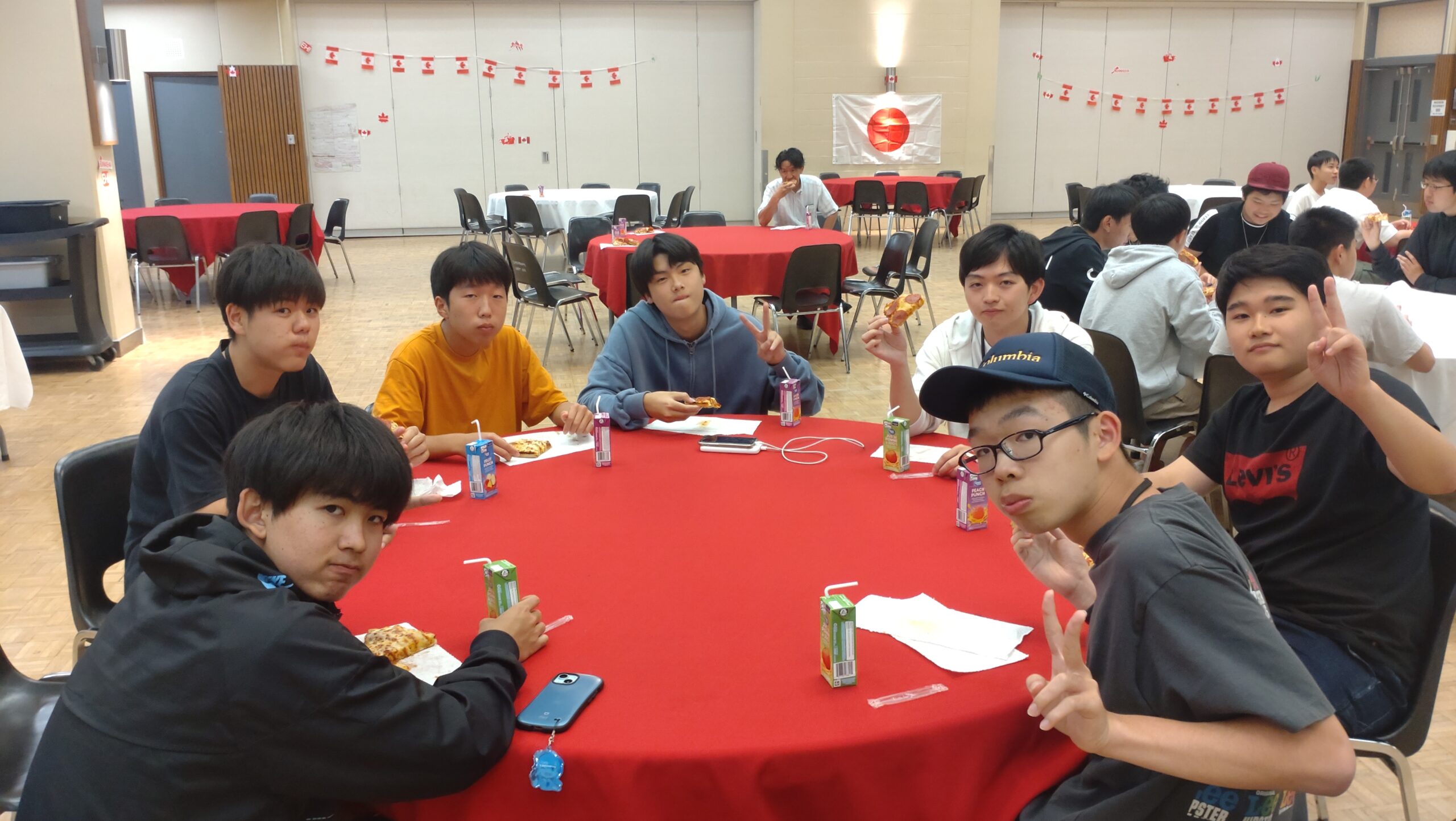 ピザが届いて、生徒たちはまず食事です。パイナップルピザはカナダでは人気ですが、豊山生にはちょっと不人気でした。空腹を満たしたら、そろそろホストファミリーが到着する時間です。ここからは生徒に自主的に動いてもらい、会を進めていきます。到着したホストファミリーを会場までエスコートしておもてなし。家庭の事情で来られないホストファミリーもいらっしゃいましたが、参加者全員がそろった18時頃、フェアウェルセレモニーがスタートしました。