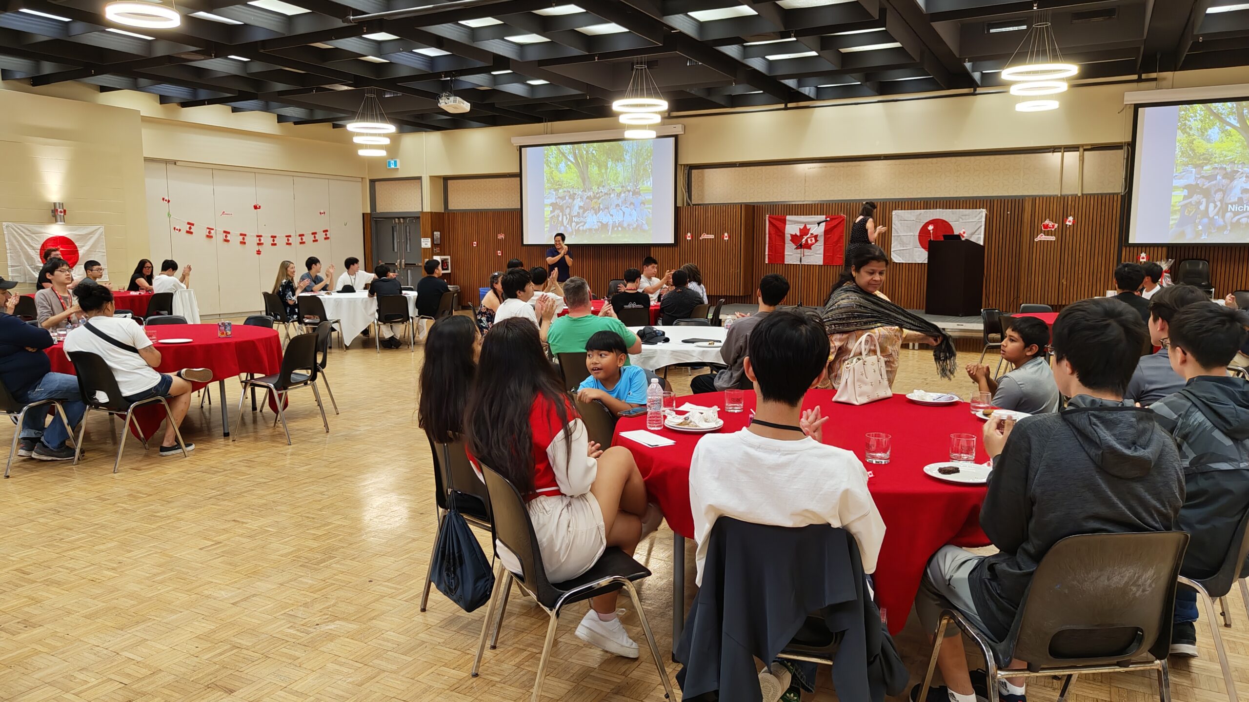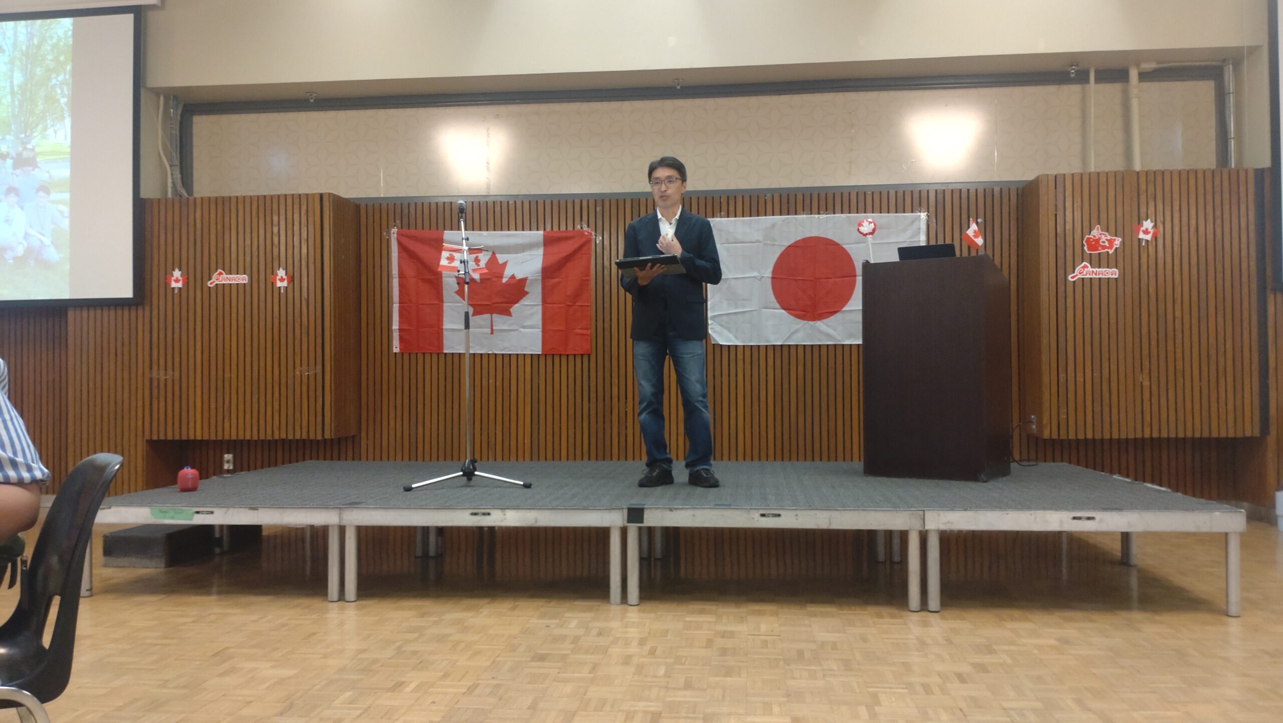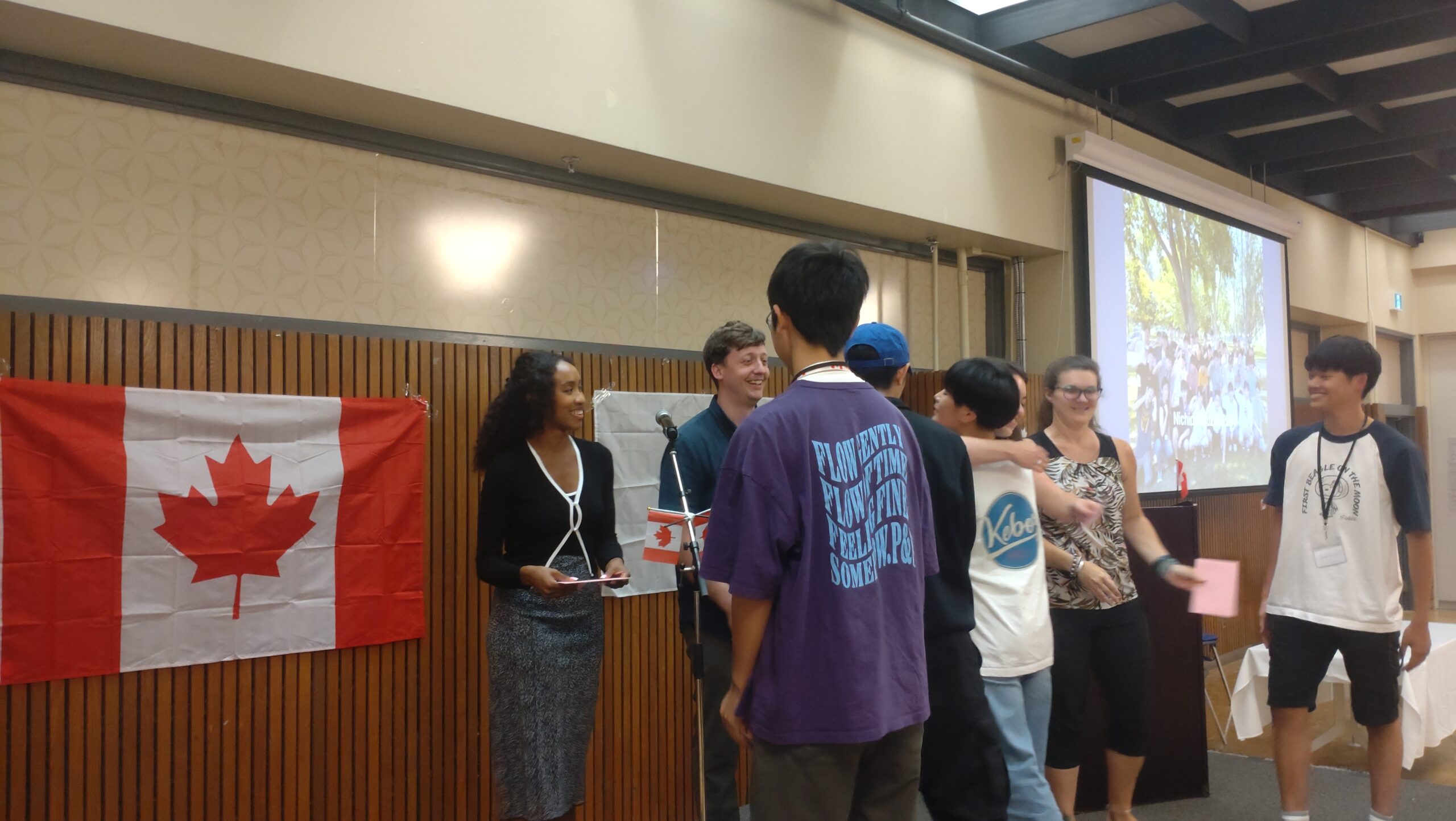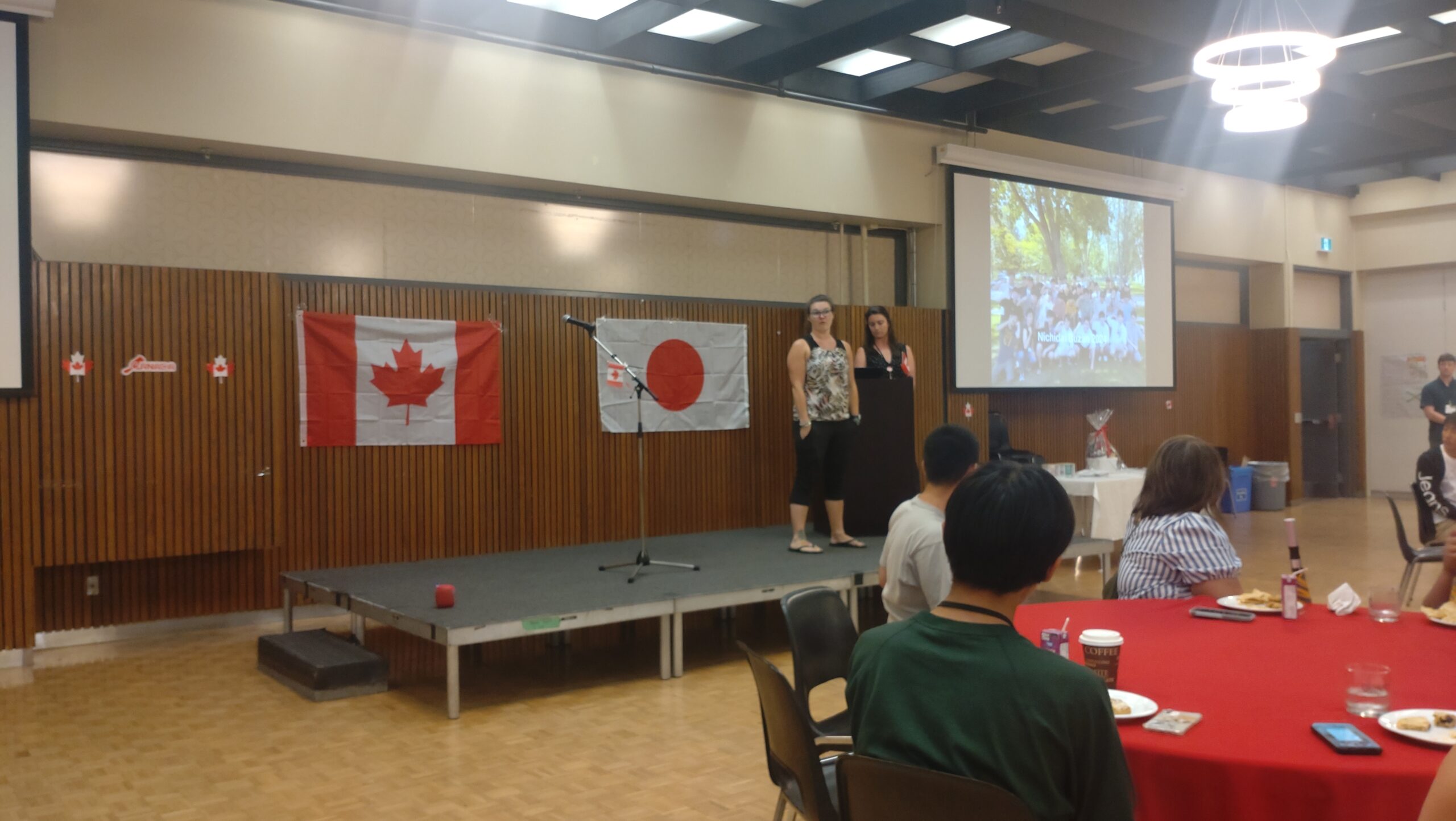 まず、今回のホームステイの責任者でもあるエイドリアン先生から開会のあいさつ。続いて、生徒の送迎の割り振りやホームステイファミリーとの連絡役をしていただいたシャウナさんからのあいさつ。そして、豊山教員からのあいさつとして青木先生が壇上に(英語でのスピーチなので、とても緊張しました:本人談)上がりました。
