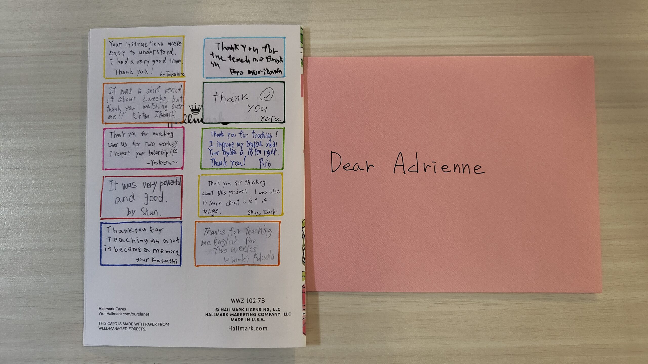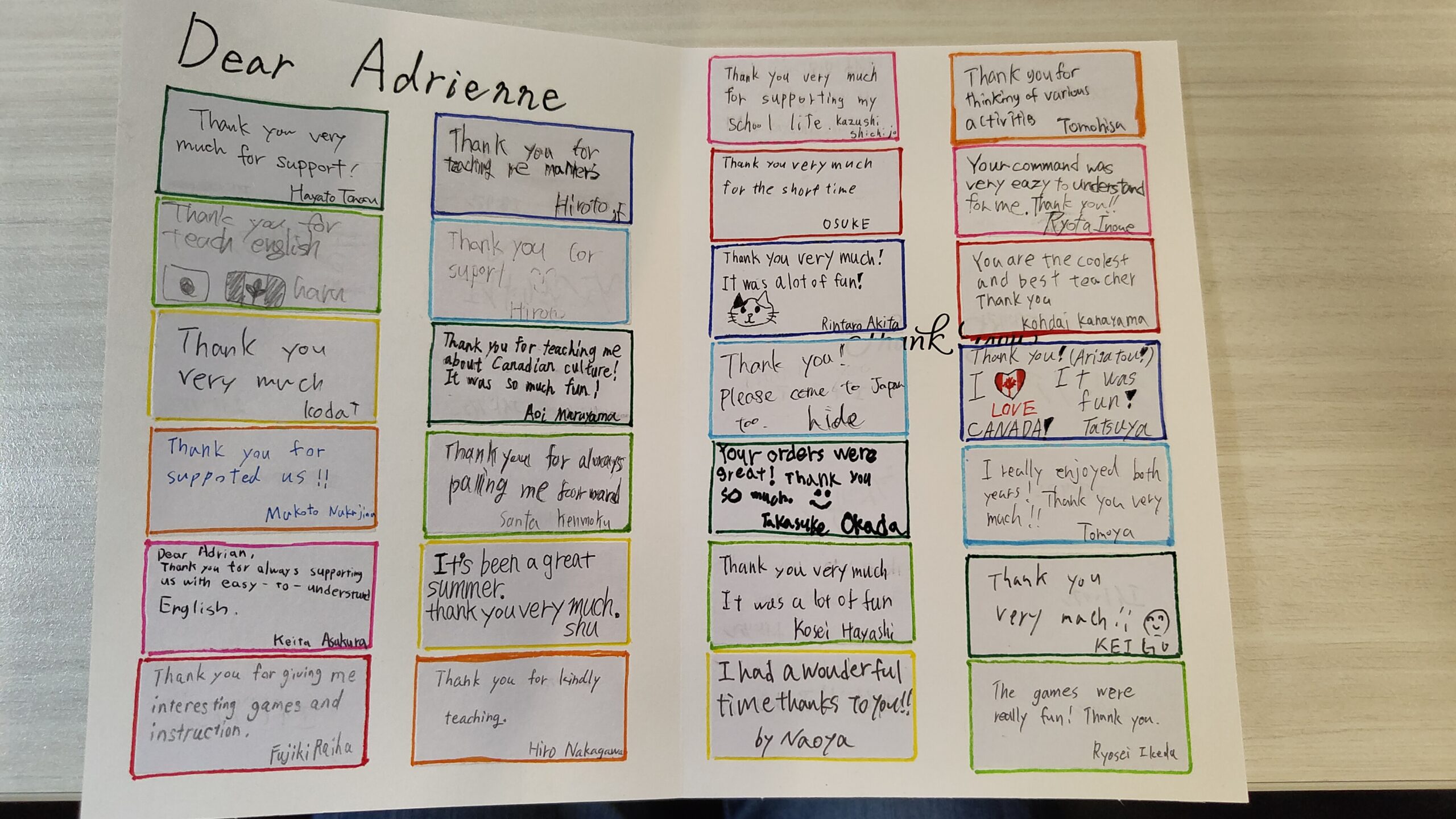 そして、準備していたサプライズ、メッセージカードを渡します。ちょっとバタついたところもありましたが、それぞれの代表生徒から、エイドリアン先生、アリーシア先生、ゴードン先生、シャウナさん、トレイシアさん、パトリーさん、フェイスさん、ミカエラさんに手渡しました。本当にこの方々がいなければ、こんな素晴らしいホームステイにはならなかったでしょう。心より感謝申し上げます。