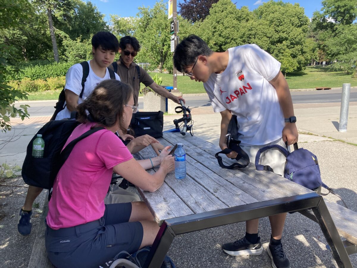特にジオキャッシングでは,バディたちと英語で会話をしながらゲームを進める楽しさがあり,見つけた生徒は”I found it!”と盛り上がり,チームと喜びを分かち合いながら,中に入っている紙に名前を書いていました。