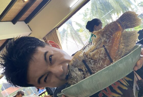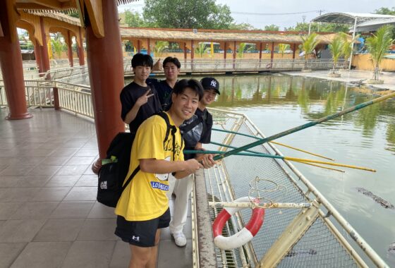 バスで移動し,スイティエン公園に到着で昼食を食べ,ワニ釣り体験をしました。