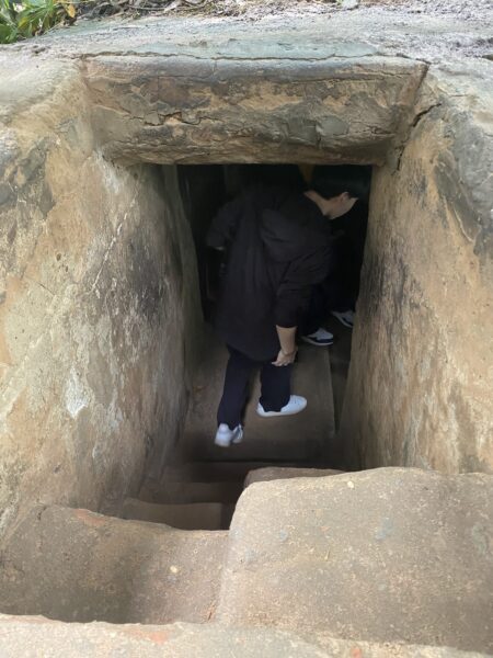 クチトンネルはベトナム戦争中のゲリラ戦の基地として作られたもので,ここでの生活スタイルや様々な罠を見学しました。
