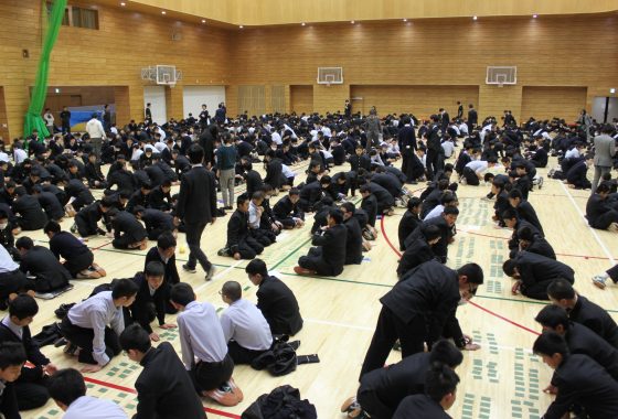 明日の中学卒業式本番に向けて、アリーナにて予行が行われました。 中学3年生はもち…