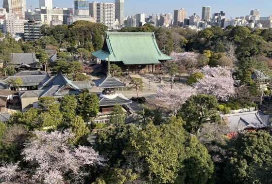 校舎屋上からの眺望です。 隣接する護国寺の桜は満開。 朝の空気は清々しいです。 …