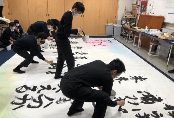 書道部初 本格的に大作にチャレンジしています。 紙を貼り合わせ、色付けして、さ~…