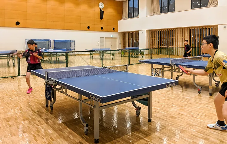 卓球部は月曜日から土曜日までの放課後、校舎3階の多目的室で活動しています。部員は全くの初心者から経験者まで様々です。練習内容は二人一組でフォア打ちやツッツキなどの「基本練習」、自分の得意もしくは不得意なところを重点的に練習する「課題練習」、そして、その日の練習の仕上げとして「試合形式」をおこなうのが基本的な流れです。日曜日や祝日は公式戦や他校との練習試合などを行うこともあります。