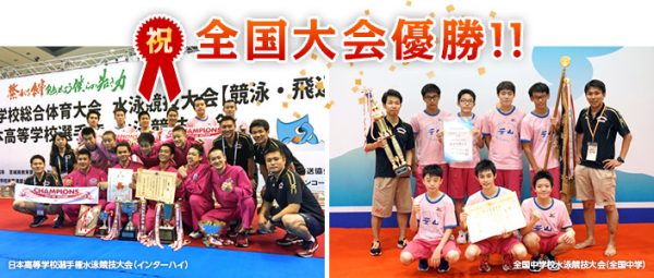 本校水泳部の生徒が見事な活躍をし、念願の優勝を果たしました。
