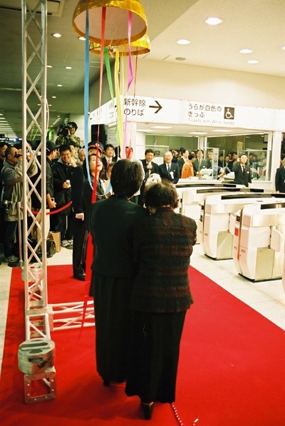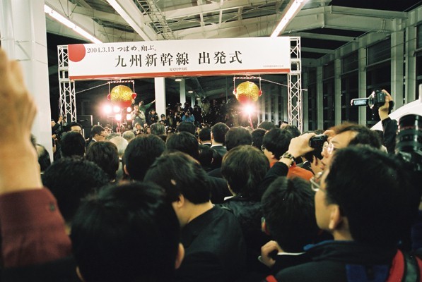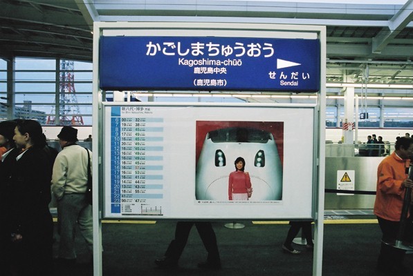 鹿児島中央駅の駅名板とイメージタレントの黒木瞳さんのポスター付き時刻表