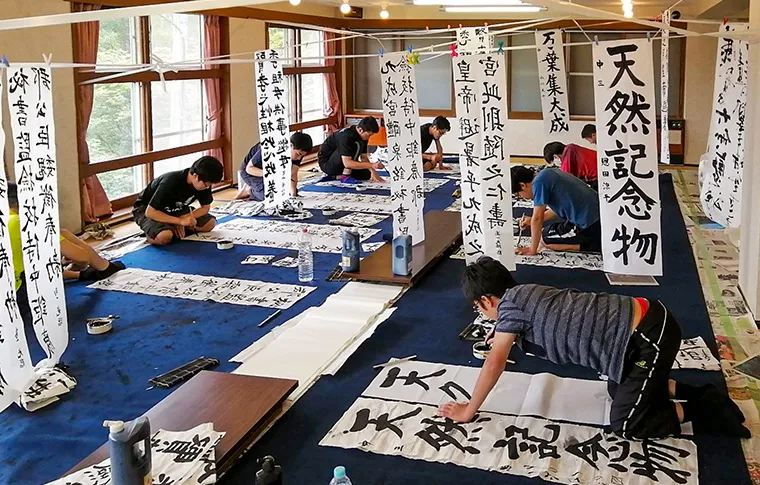 書道部では、競書大会に向けて、主に半紙で練習を行っています。また、大きな作品を製作することもあります。毎年8月上旬あたりに行われる夏季合宿では、競書大会だけでなく、豊山祭にも向けて作品製作をおこないます。2泊3日の合宿の目的は、作品製作に加えて、集団生活の中から規律・自主性・協調性を学ぶことです。普段は半紙の製作をしていますが、2泊3日の合宿では、大きな作品を集中して製作することができて、より有意義に活動をすることができます。