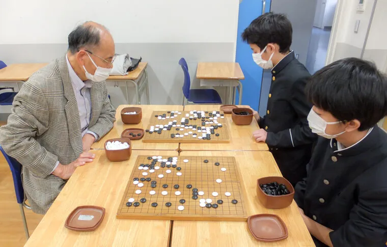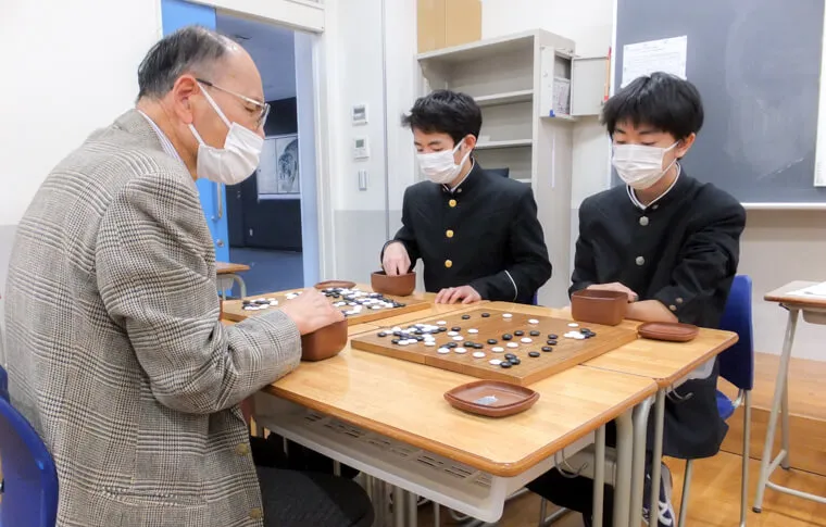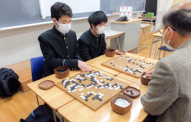 対局をした後、振り返り(検討)を行っています。部員全員がアマ二段以上。コーチの指導も受けています。時間が余った時は詰碁をしています。また部員同士でも対局します。